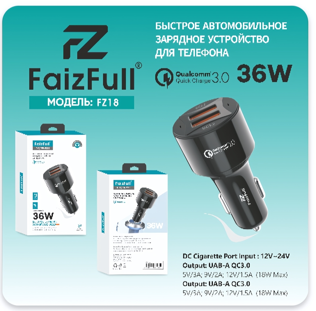 Автомобильное зарядное устройство «FZ18» 36W с QC3.0, 2xUSB, быстрая зарядка, черный