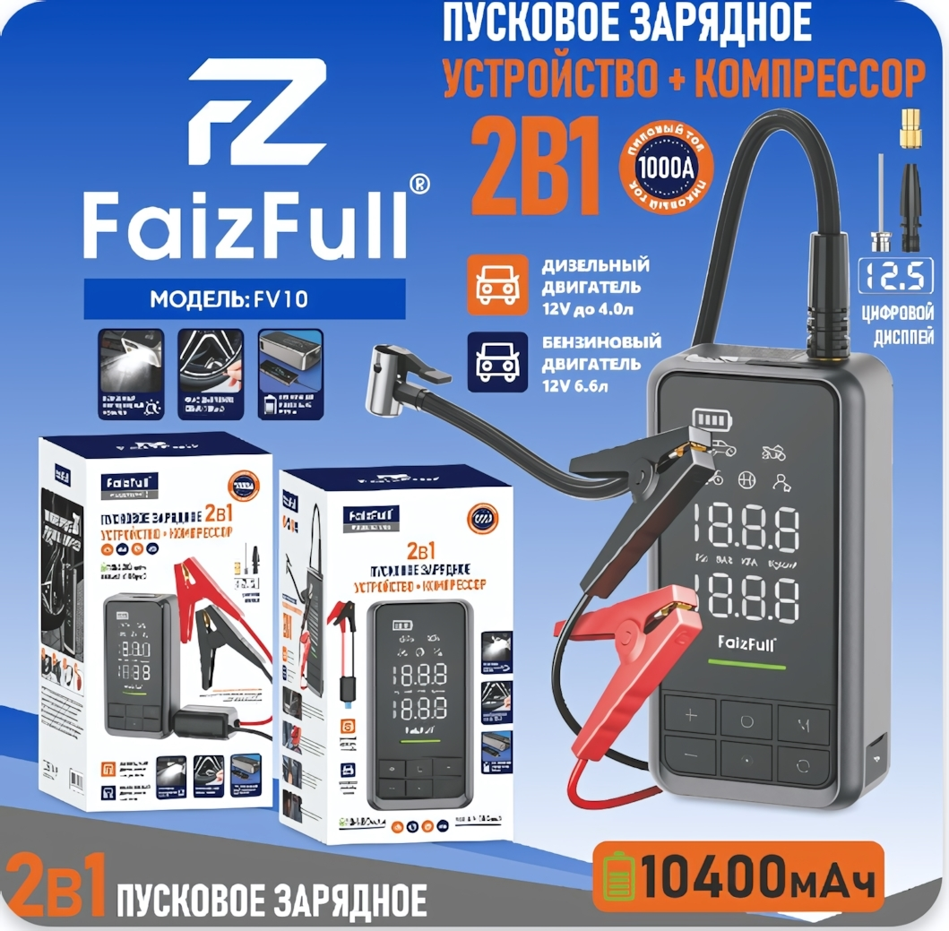 Автомобильный компрессор FaizFull FV10 — это идеальное решение для тех, кто ценит комфорт и безопасность на дороге. С его помощью вы сможете быстро и эффективно накачать шины вашего автомобиля, а также использовать его как пусковое зарядное устройство для аккумулятора. Это устройство станет незаменимым помощником в любых поездках, обеспечивая вам уверенность в том, что вы всегда готовы к любым неожиданностям.