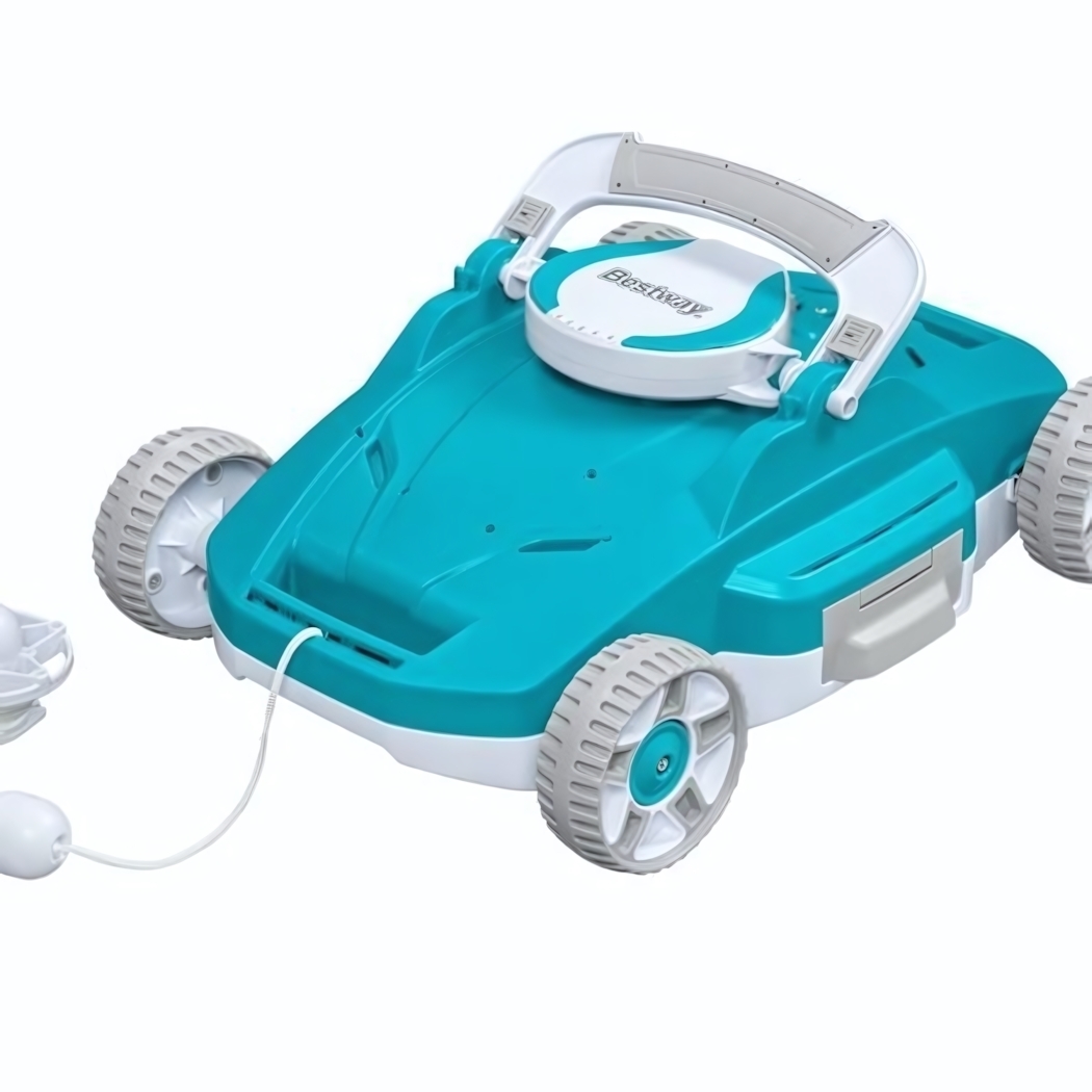 Робот выполнен из прочного пластика и представлен в стильном бирюзовом цвете с белыми и серыми деталями. Он оснащен четырьмя колесами для легкого передвижения по дну бассейна и ручкой для удобного переноса. Aquatronix G200 — это надежное решение для поддержания чистоты вашего бассейна, позволяющее снизить расходы на химию и уход за водой.