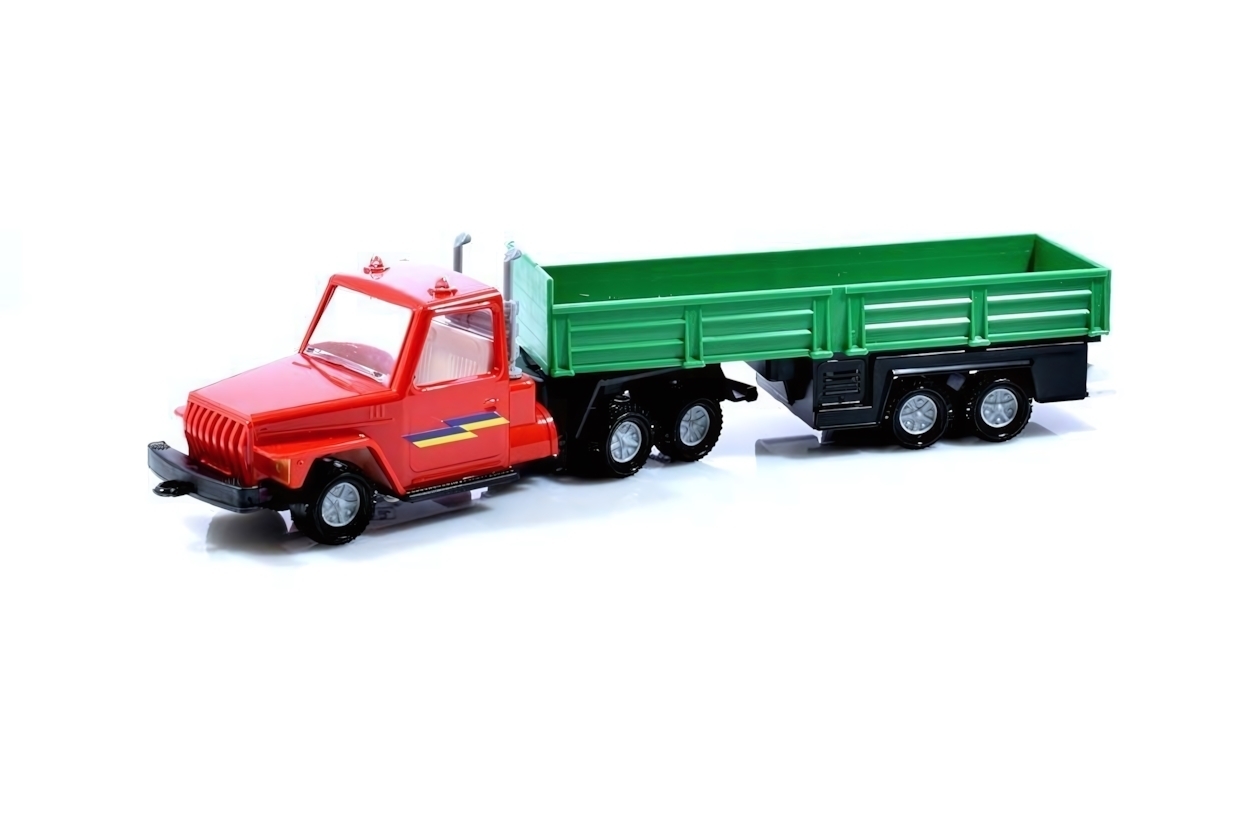 Автоприцеп окрашен в зелёный цвет и имеет открытый кузов с бортами, что позволяет перевозить различные игрушки и предметы. Размеры игрушки соответствуют стандартам для детских игрушек, что делает её удобной для маленьких ручек. Подарите своему ребенку возможность стать настоящим водителем с автоприцепом 'Урал'!