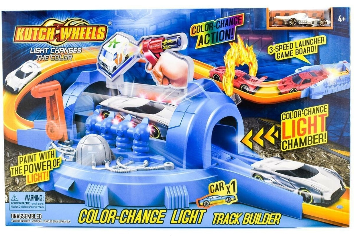 Автотрек 'Kutch Wheels' создан для маленьких любителей скорости и зрелищных трюков. Уникальная система тоннеля позволяет менять цвет машинки прямо во время заезда, добавляя игре волшебства и непредсказуемости.