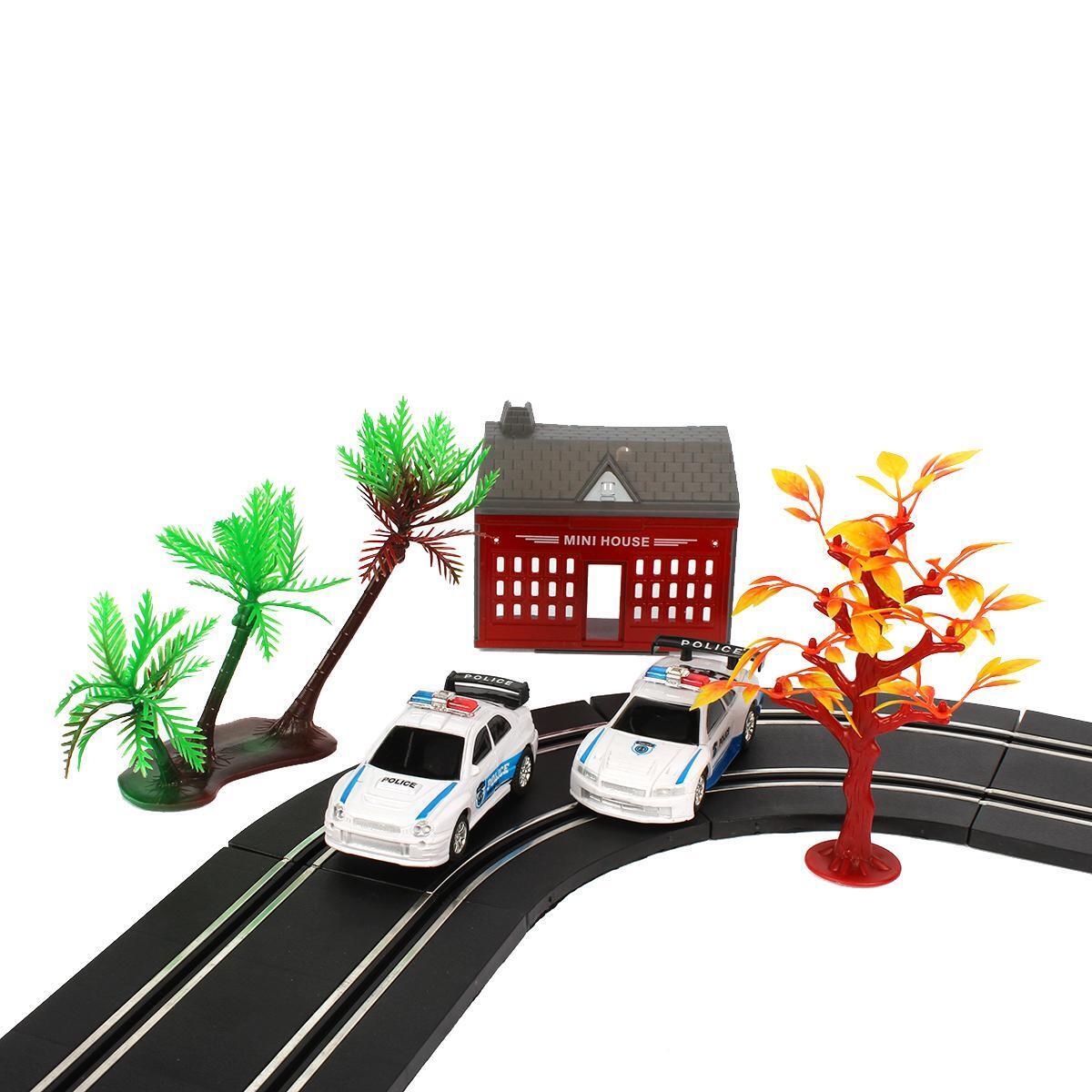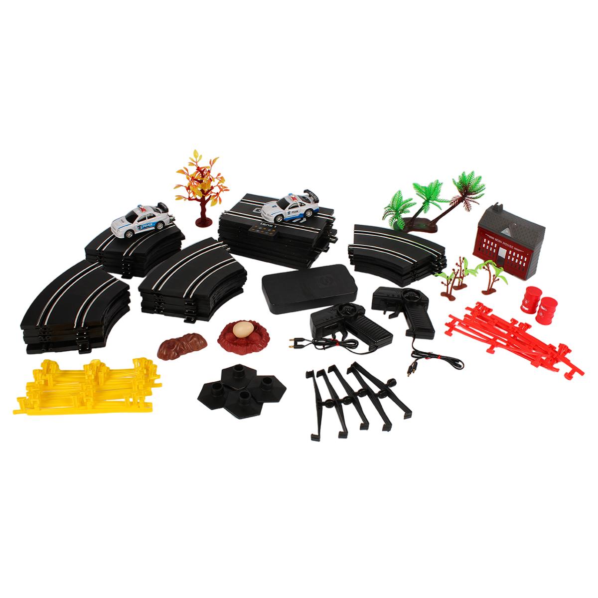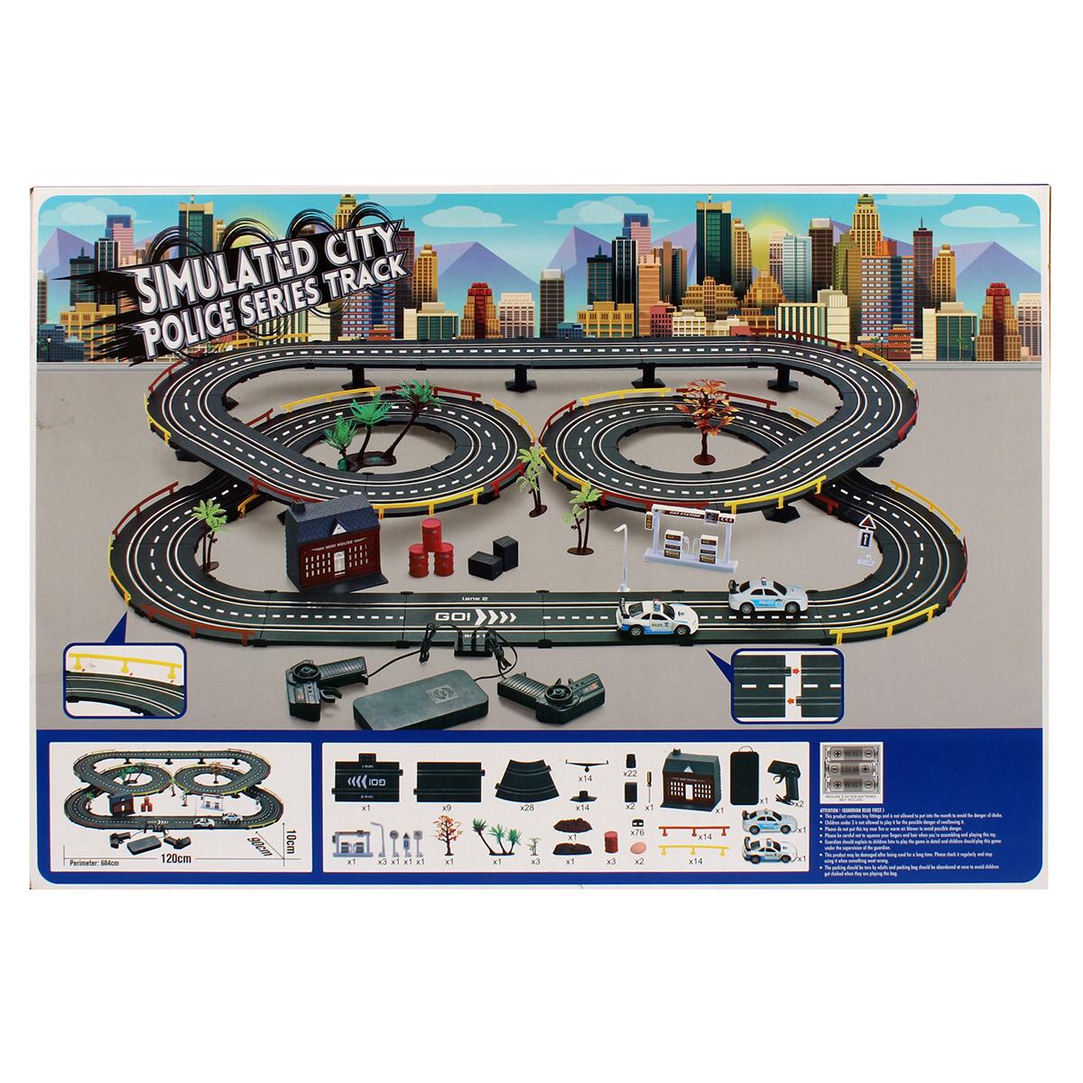 В набор входит 220 деталей, включая элементы трассы, два полицейских автомобиля, деревья, здания и другие аксессуары. Размер упаковки: 59 x 8.5 x 41 см.