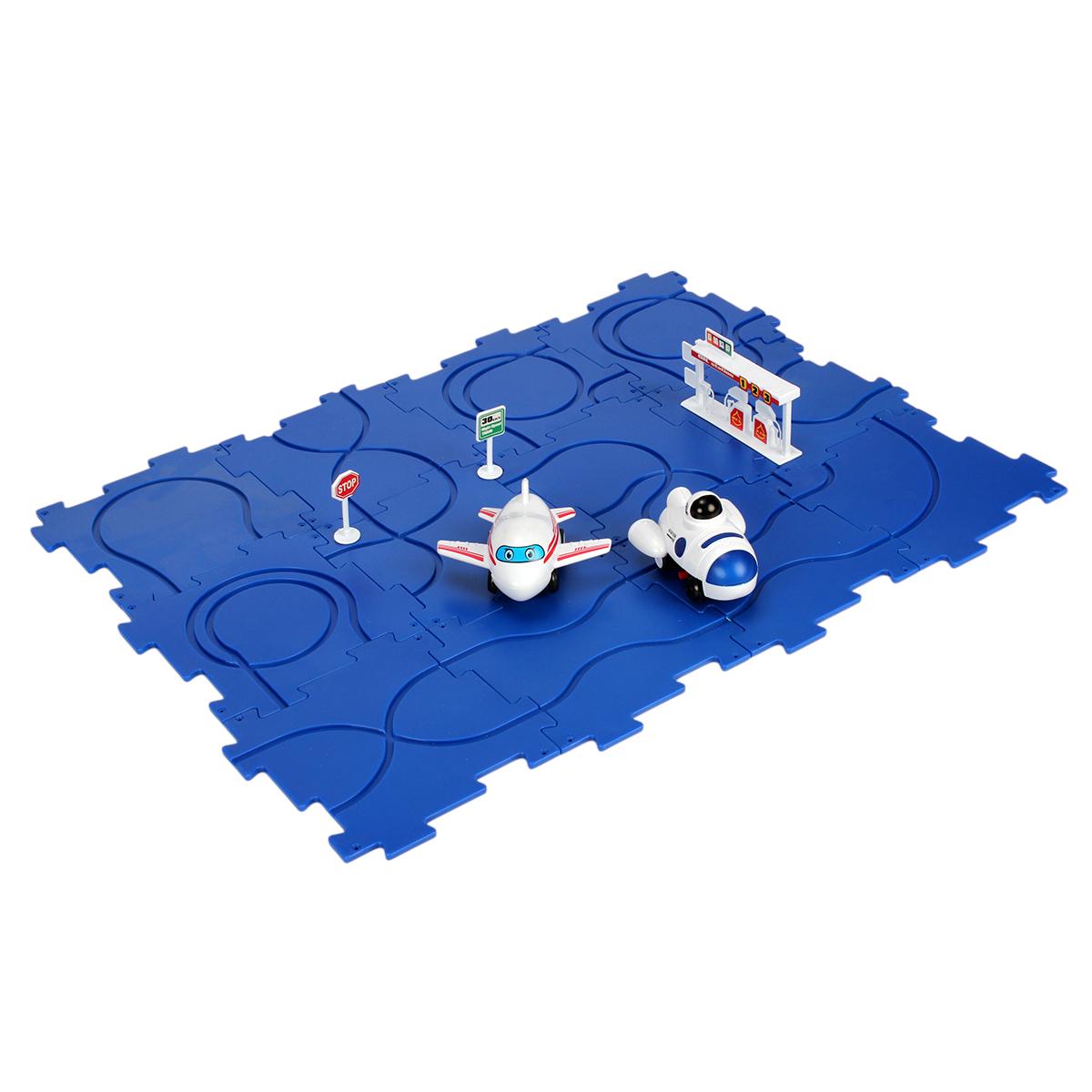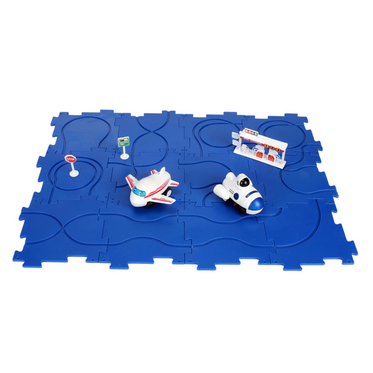 Этот игровой набор представляет собой детский автотрек с машинками, заправочной станцией и дорожными знаками, выполненными из безопасного пластика.