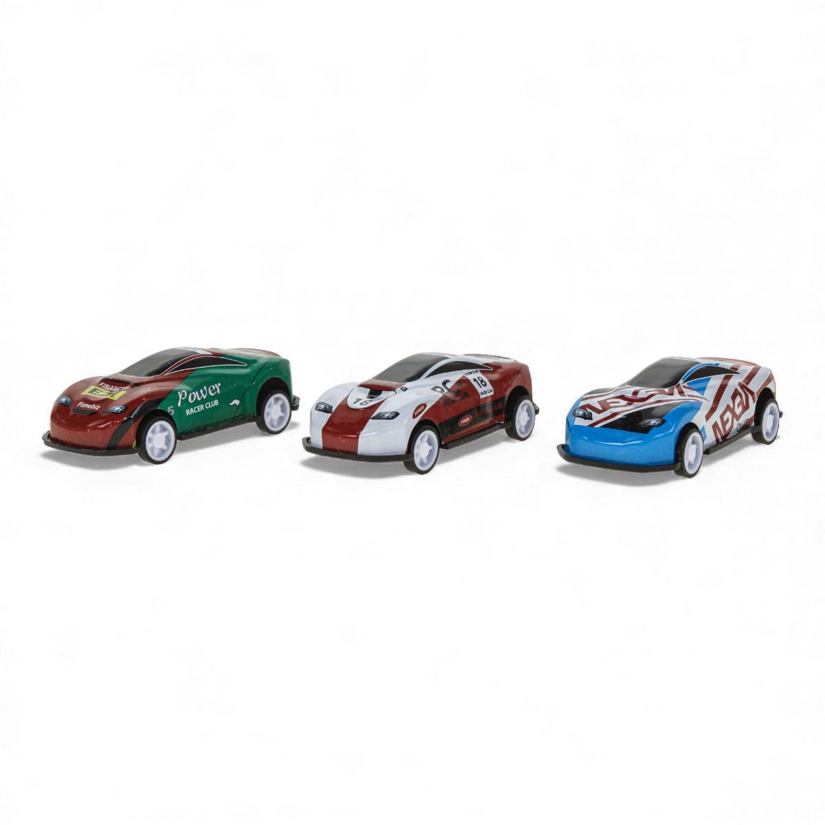 - 4 машинки в комплекте: красная, синяя, серебристая, оранжево-зелёная — разноцветный принт, каждая с инерцией