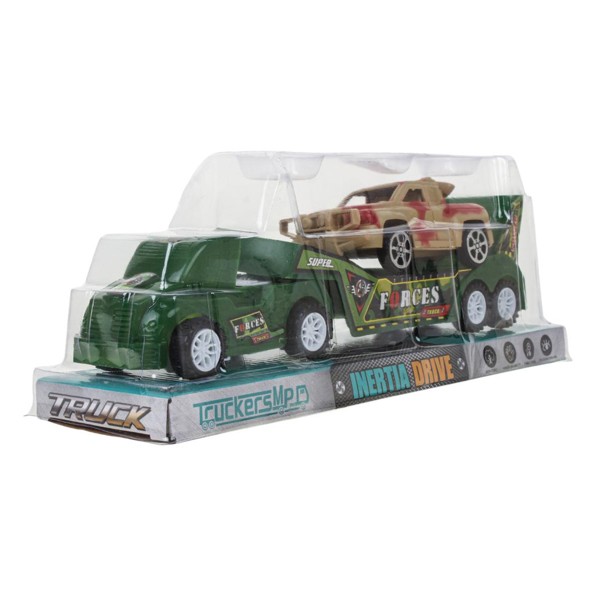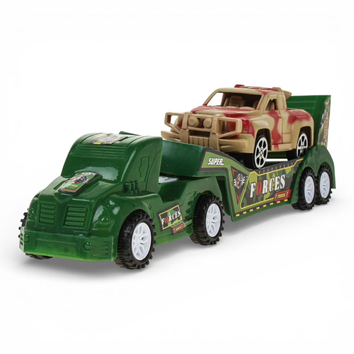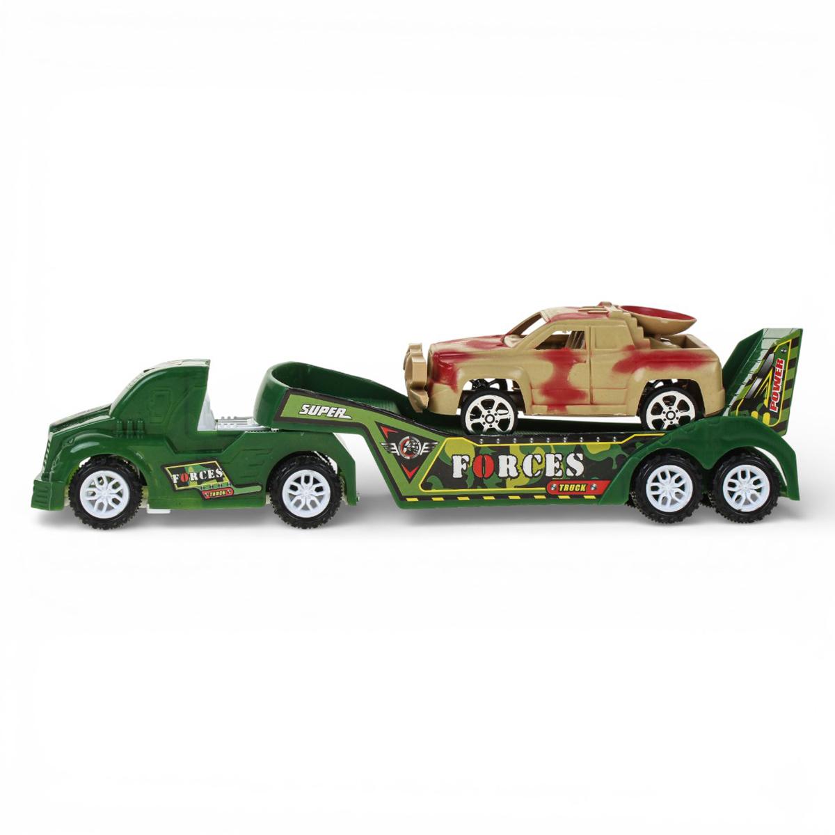 - Яркий дизайн: Автовоз выполнен в насыщенном зелёном цвете с детализированными надписями «TRUCK» и «SUPER FORCES», что делает его очень реалистичным.