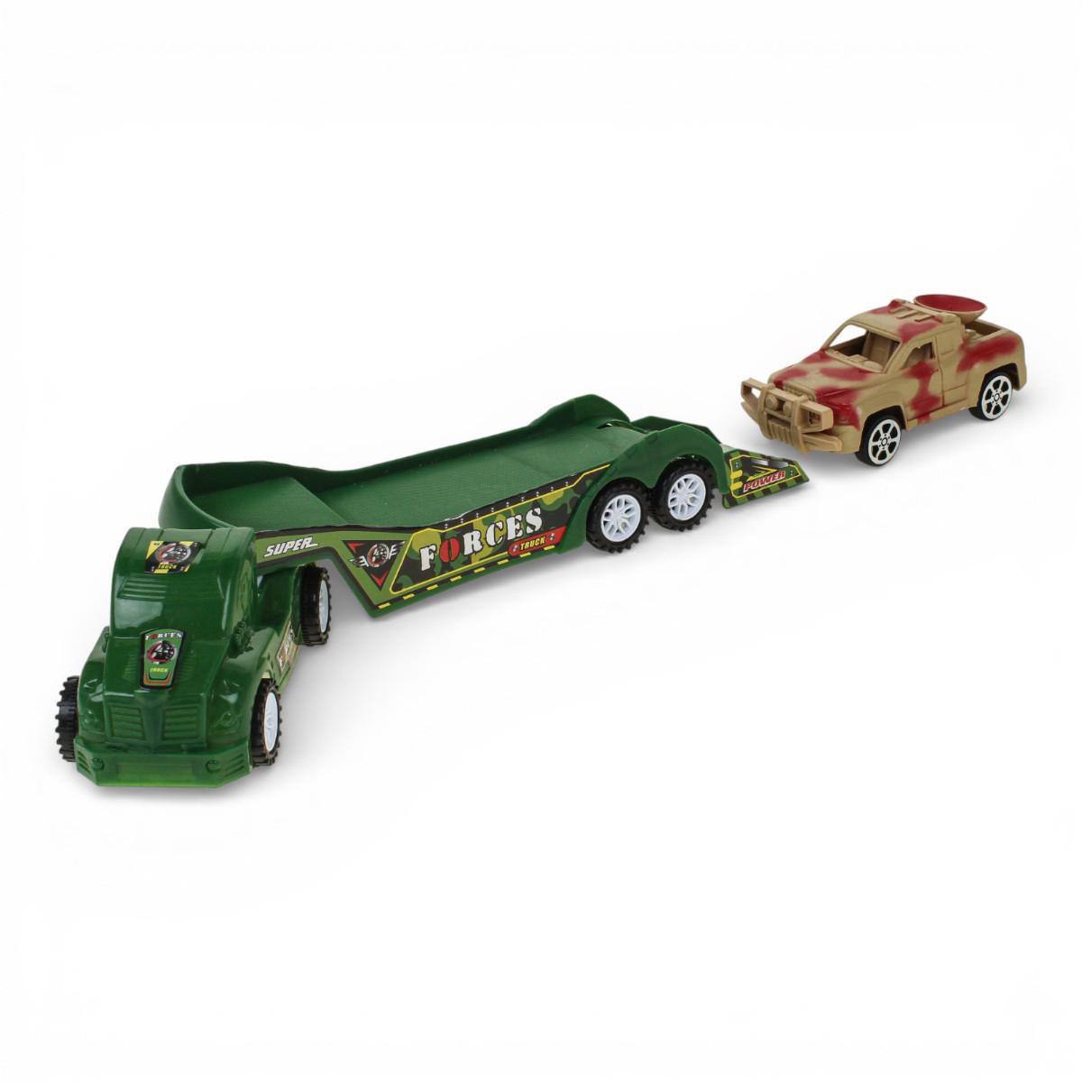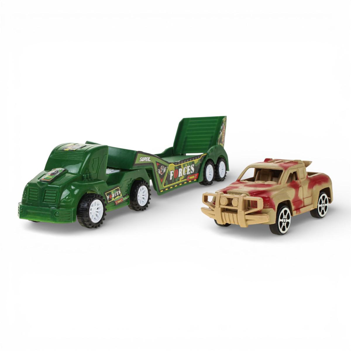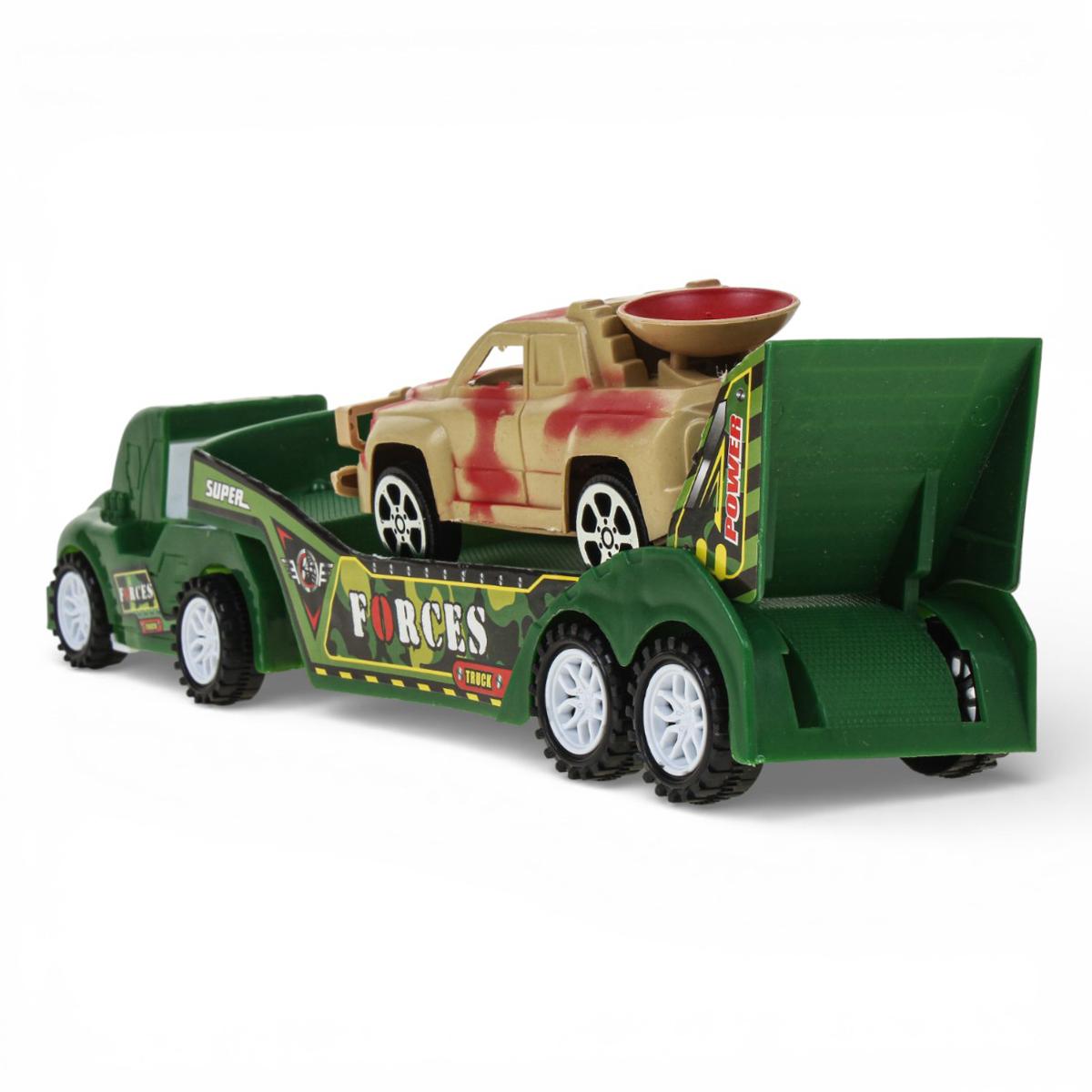 - Яркий дизайн: Автовоз выполнен в насыщенном зелёном цвете с детализированными надписями «TRUCK» и «SUPER FORCES», что делает его очень реалистичным.