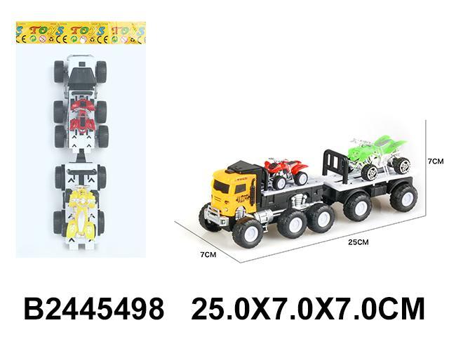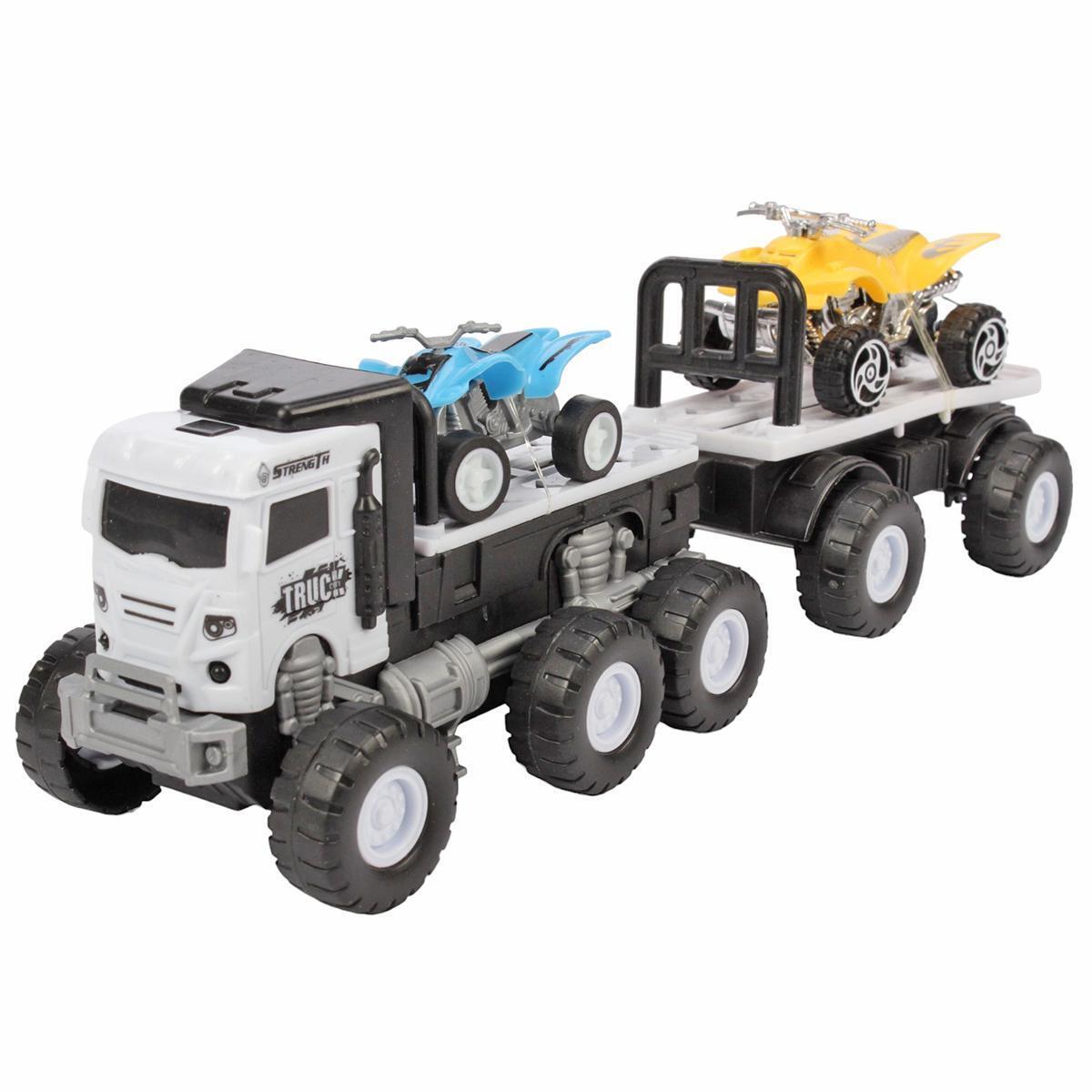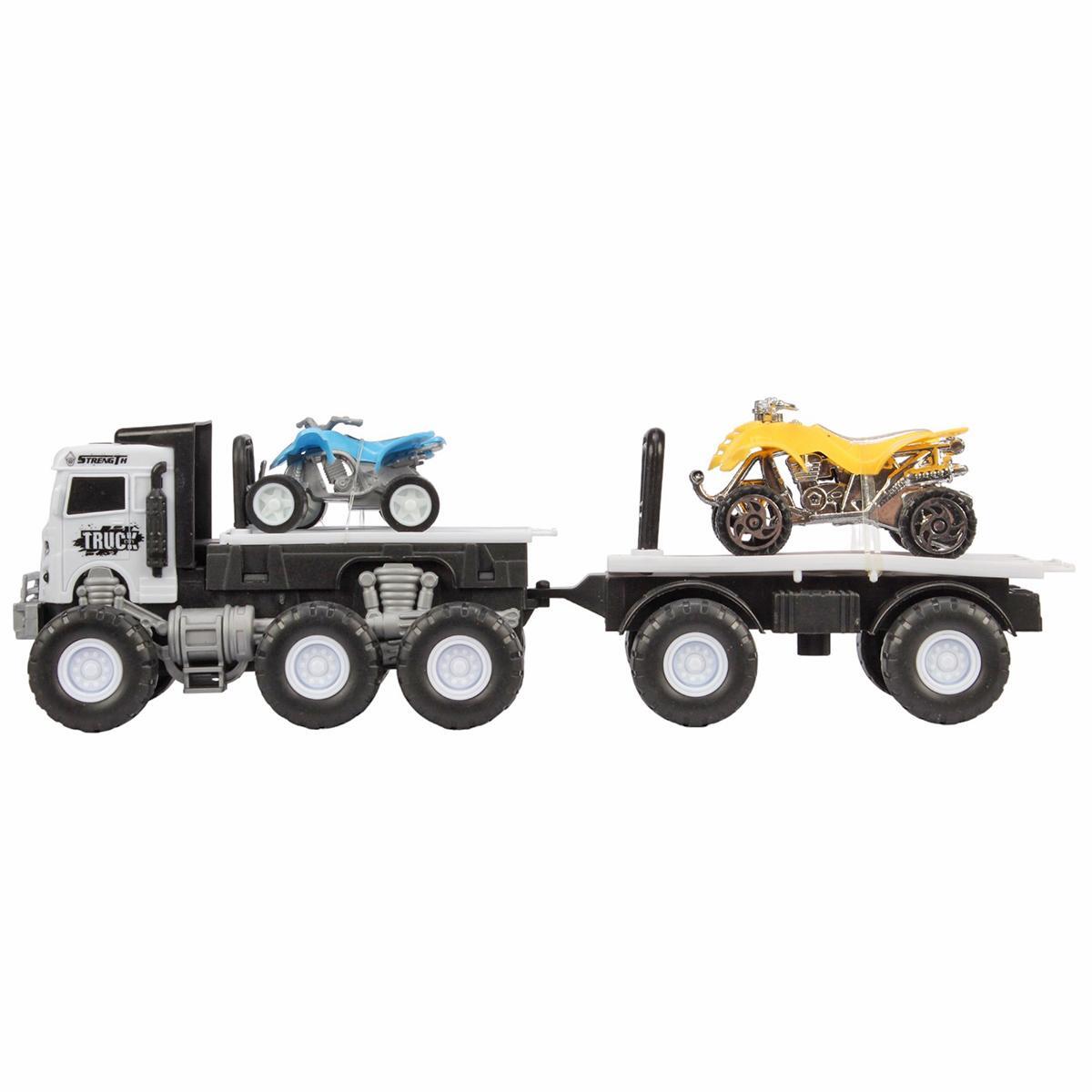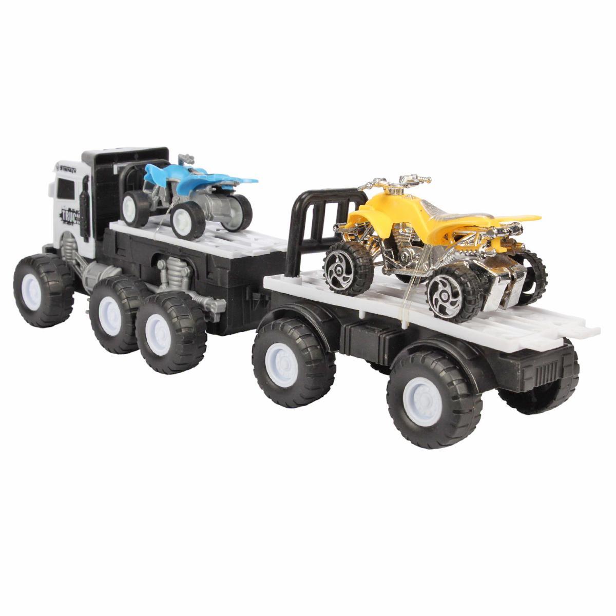 Размер игрушки — 25х7х7 см. Корпус выполнен из пластика, цвета грузовика — черно-белый. В наборе: 1 грузовик и 2 миниатюрных квадроцикла контрастных оттенков. Все элементы тщательно проработаны для безопасной длительной эксплуатации.