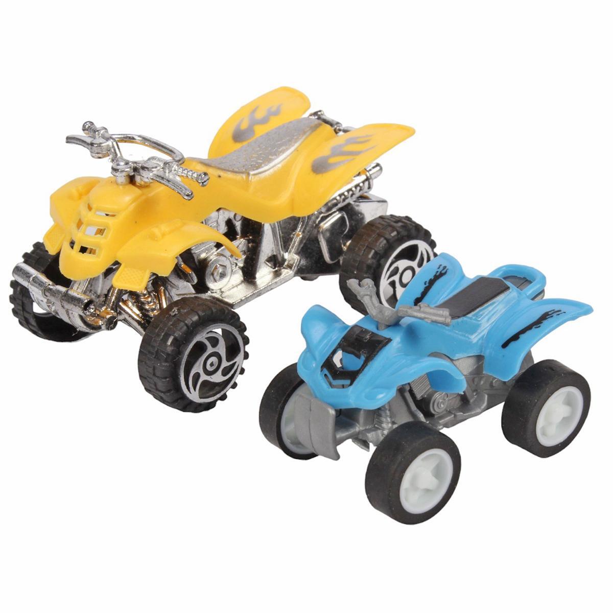 Благодаря инерционному механизму грузовик способен ехать самостоятельно — просто оттяните его назад, отпустите, и он поедет вперед! Удобная платформа с бортиками позволяет надежно разместить два квадроцикла. Отличное решение для малышей, которые любят транспорт и яркие игрушки.