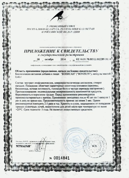 Капсулы «Бонисан» предназначены для женщин, которые хотят улучшить свое самочувствие в период менопаузы. Рекомендуется начинать прием после 40 лет в профилактических целях или при появлении первых симптомов климакса. Препарат можно принимать в любое время, и его отмена не повлияет на ваше здоровье.