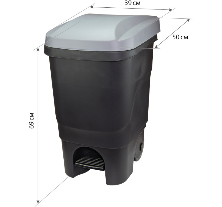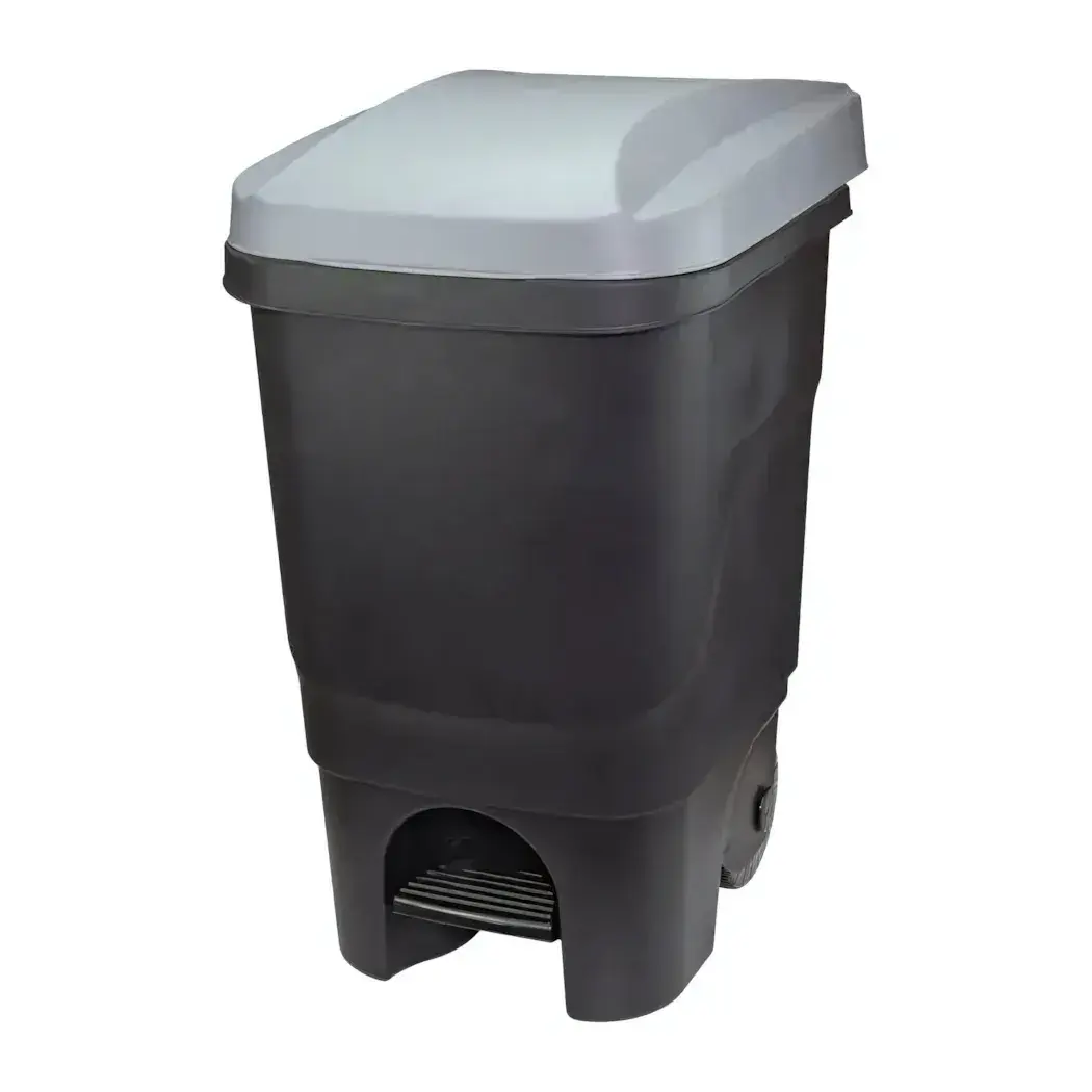 Бак мусорный 60л с педалью и колесами, пластик, серый/черный, прямоугольный