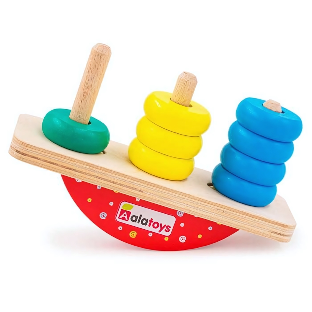 Балансир выполнен из дерева и окрашен безопасными красками. Он имеет округлую платформу красного цвета с тремя стержнями, окрашенными в зеленый, желтый и синий цвета. Каждое кольцо имеет центральное отверстие для удобного нанизывания. Игрушка станет отличным подарком для любого малыша и поможет ему развивать важные навыки в игровой форме.