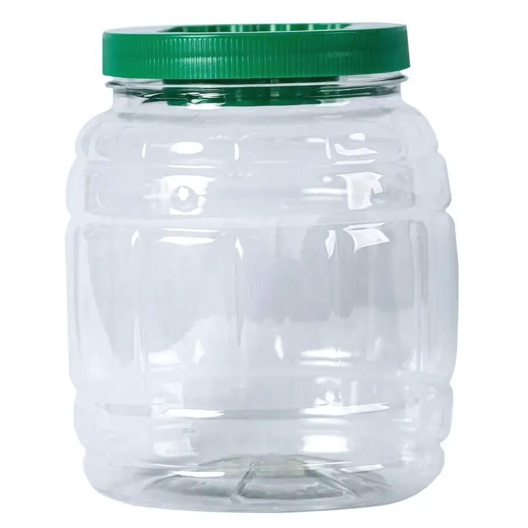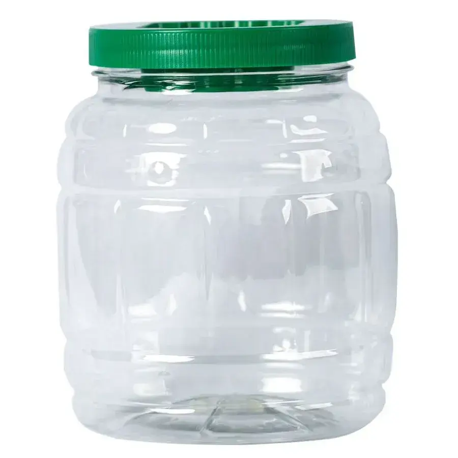 Банка пластиковая 2л, форма бочонка, прозрачная с крышкой зеленой