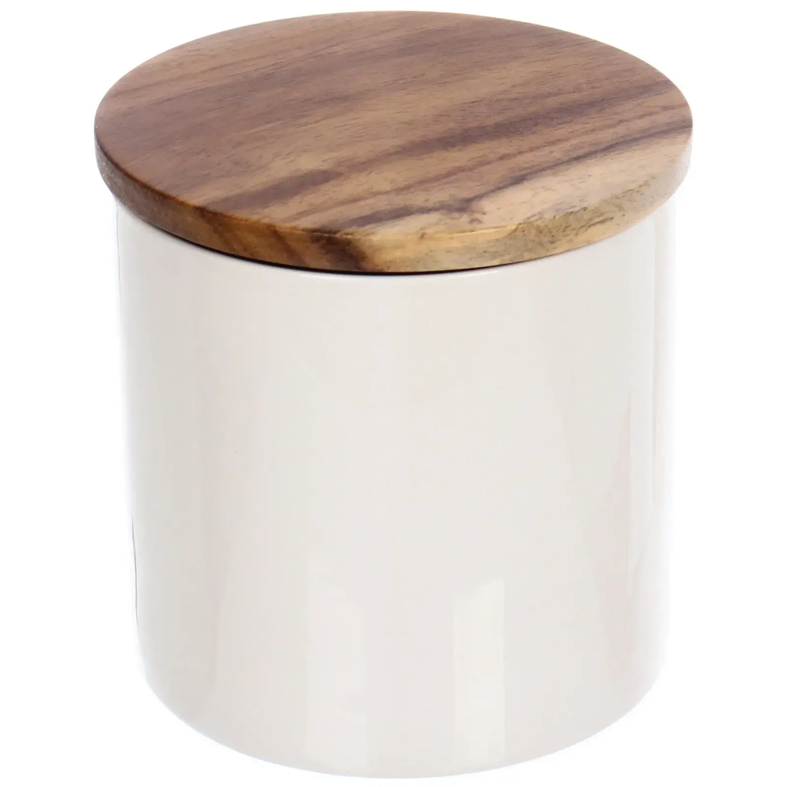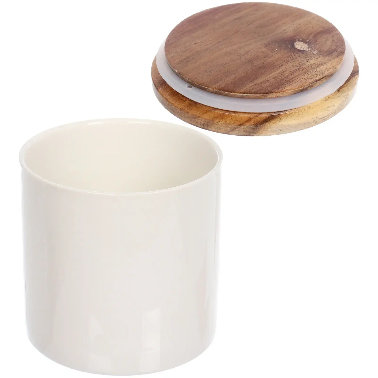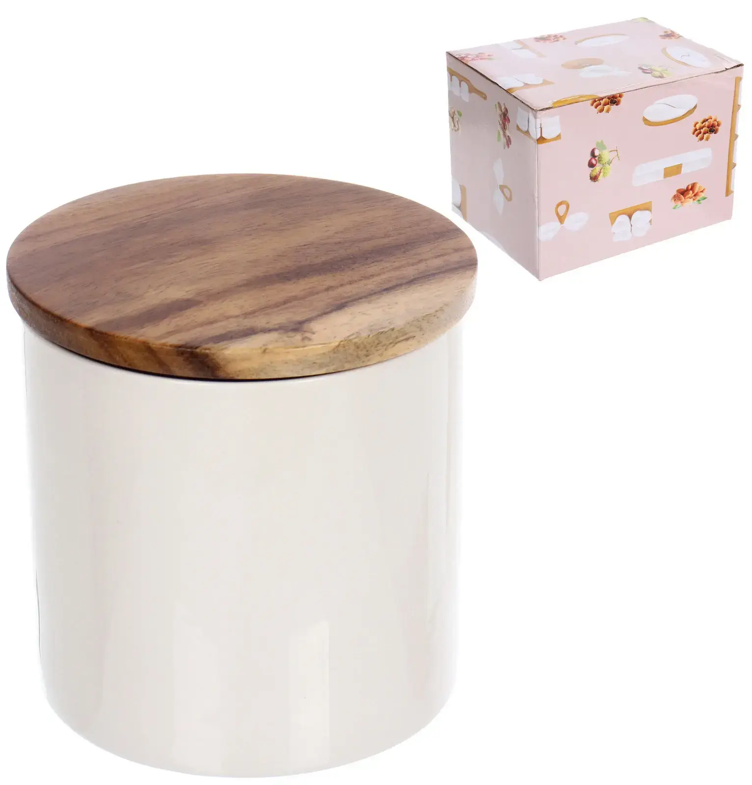 Банка предназначена для хранения продуктов, бытовых мелочей или даже для использования в качестве элемента декора. Её цилиндрическая форма и гладкая поверхность делают её удобной в использовании и легкой в уходе. Деревянная крышка с естественной текстурой обеспечивает надежное закрытие, что позволяет сохранить содержимое свежим и защищенным от внешних факторов.