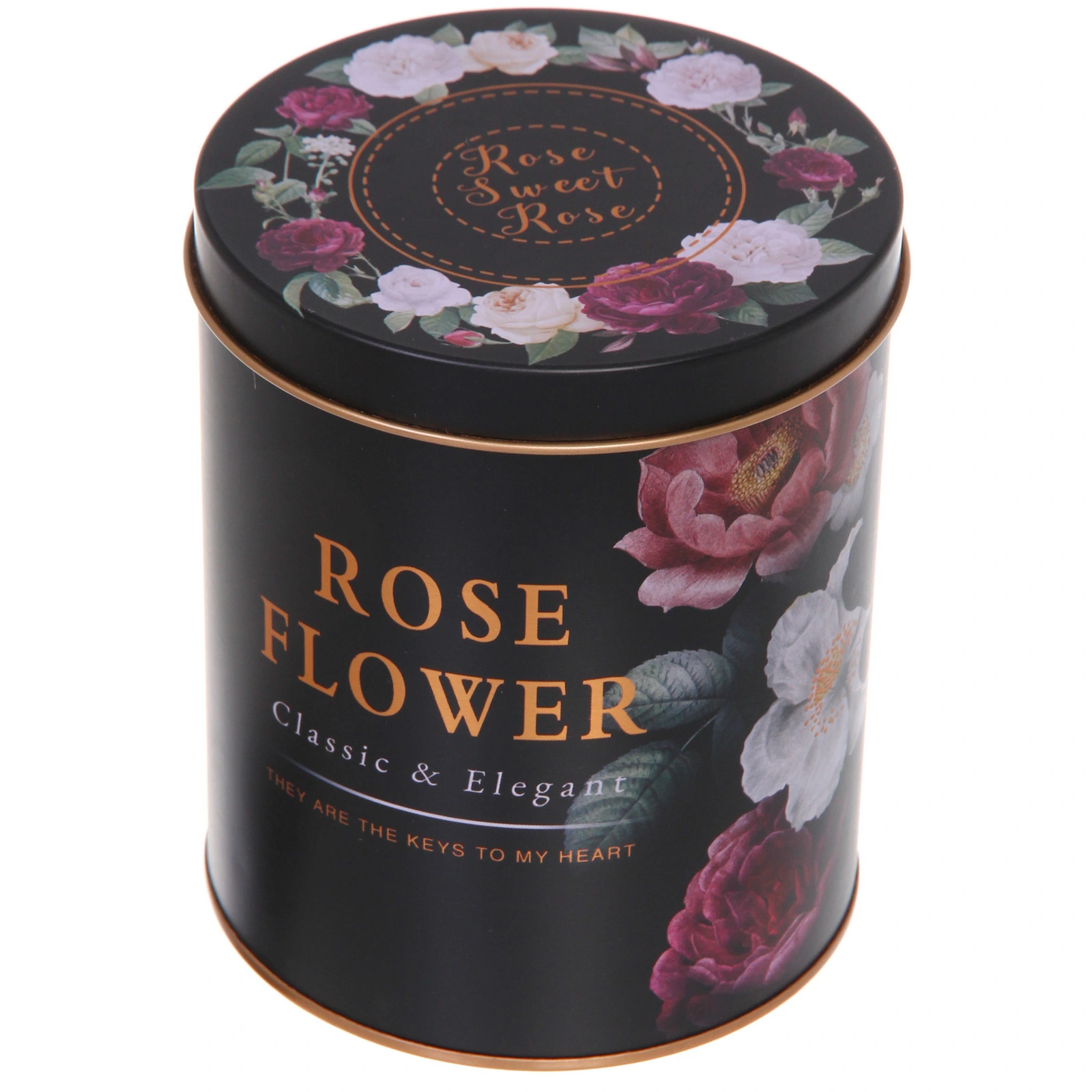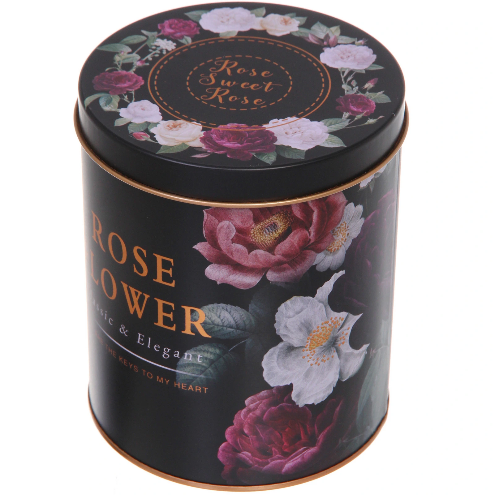 Корпус выполнен из жести — прочного и практичного материала, устойчивого к повседневному использованию. Черная поверхность с декоративным принтом роз и аккуратными золотистыми элементами делает банку не только функциональной, но и декоративной деталью интерьера. Она гармонично впишется как в классическую, так и в современную кухню.