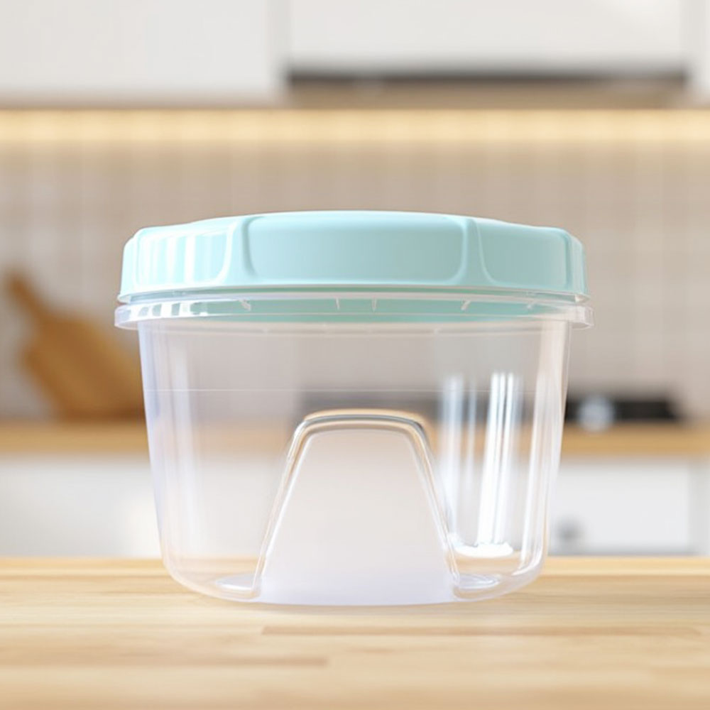 Эта многофункциональная емкость легко моется в посудомоечной машине, что значительно облегчает уход. Ее прозрачные стенки позволяют быстро увидеть содержимое, а компактный круглый дизайн с выступающей частью для захвата обеспечивает удобство в использовании. Основной материал — пищевой полипропилен — гарантирует экологическую безопасность и долговечность.