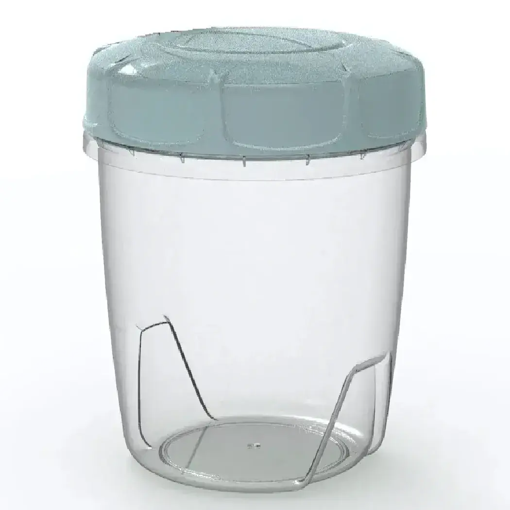 Цилиндрический корпус диаметром 12 см и высотой 18 см оптимален для хранения сыпучих продуктов. Крышка светло-голубого или серого цвета (отгрузка случайным образом) дополнена эргономичным замком. Устойчивое дно предотвращает опрокидывание даже при полной загрузке.