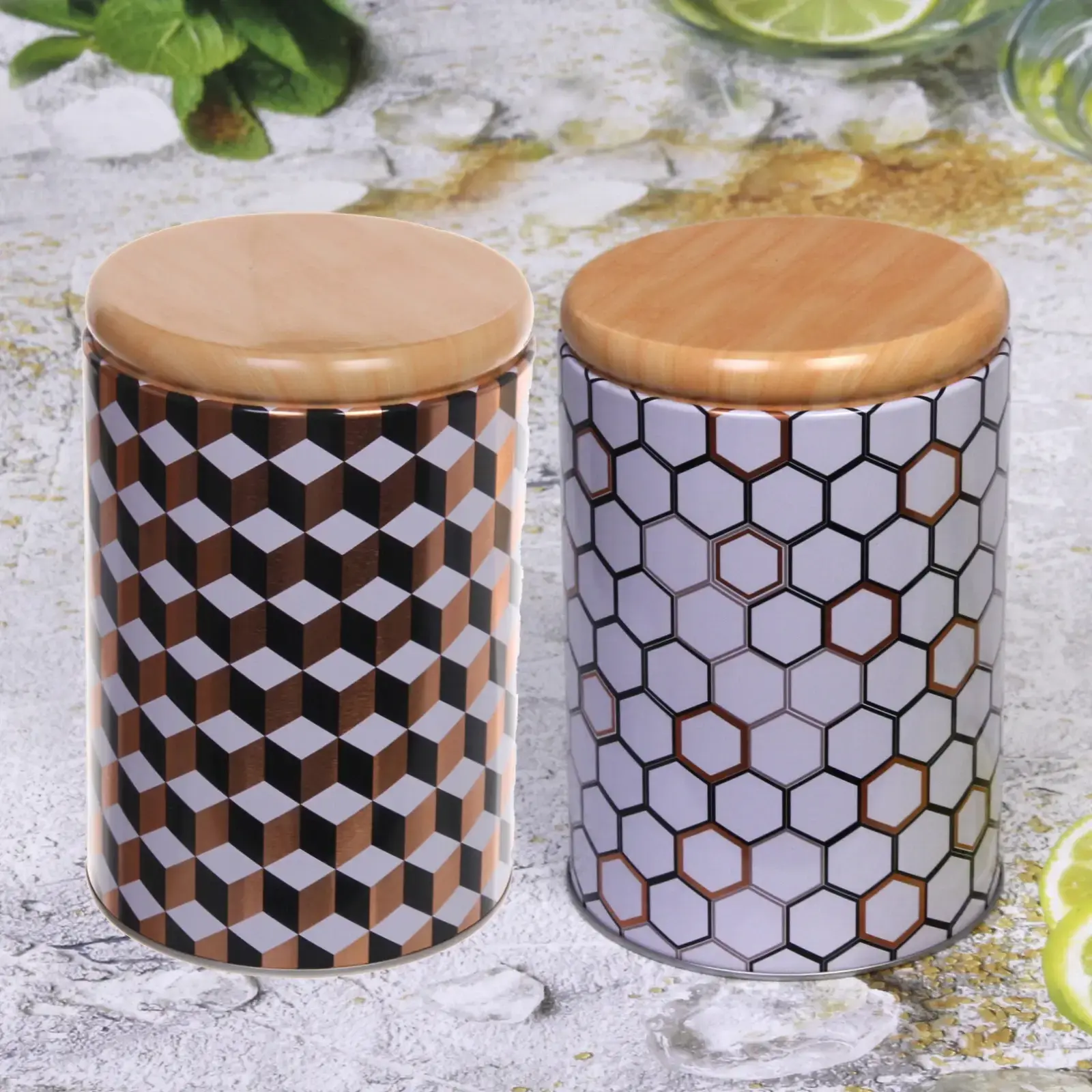 Металлическая банка «Geometry» сочетает современный дизайн и практичность хранения. Идеально подходит для чая, кофе, круп и специй, сохраняя их аромат и свежесть благодаря плотному прилеганию деревянной крышки.