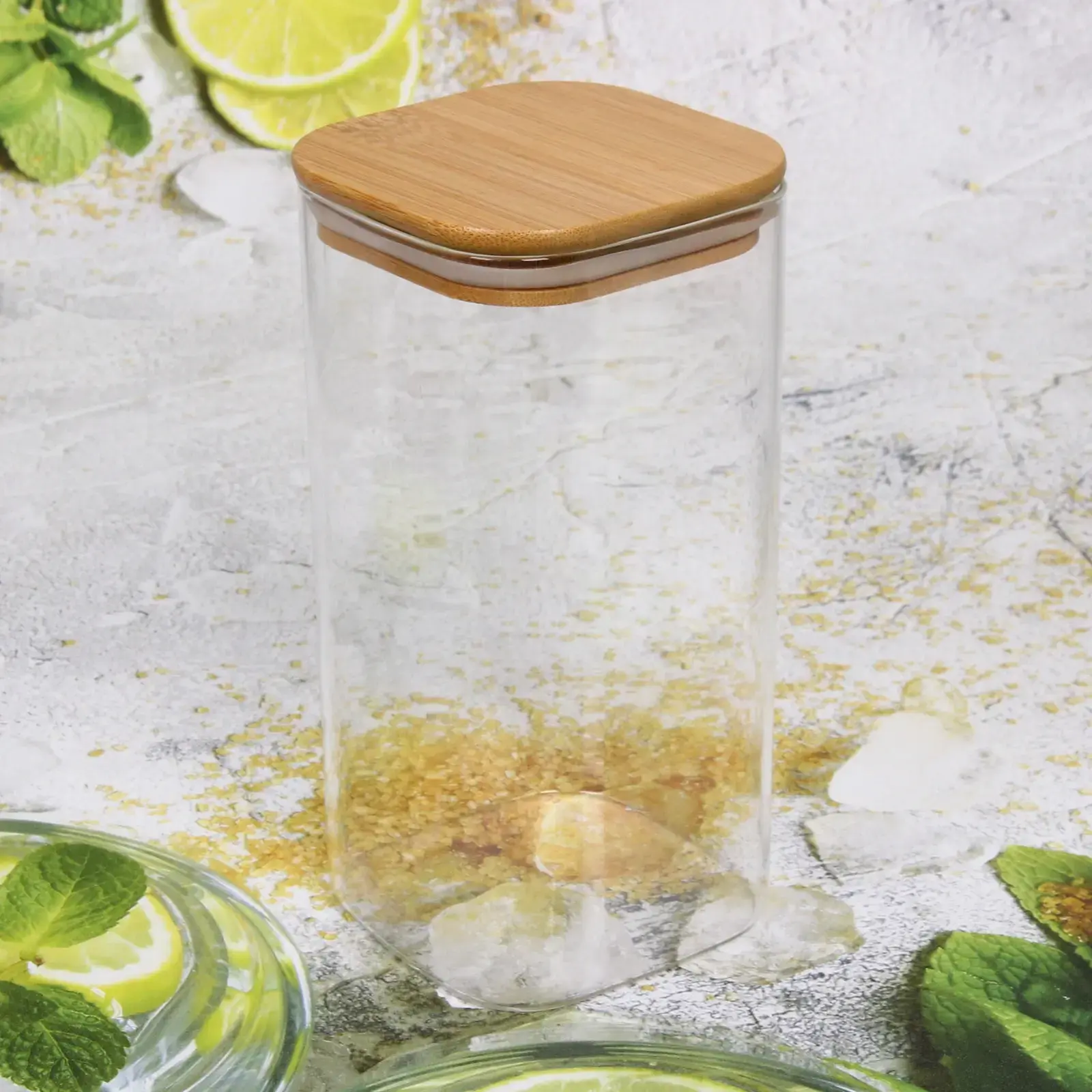 Эта банка идеально подходит для хранения сыпучих товаров, таких как крупы, сахар или специи. Прозрачные стенки позволяют видеть содержимое, что делает процесс выбора ингредиентов быстрым и удобным. Бамбуковая крышка обеспечивает надежное герметичное закрытие, сохраняя свежесть продуктов на долгое время.