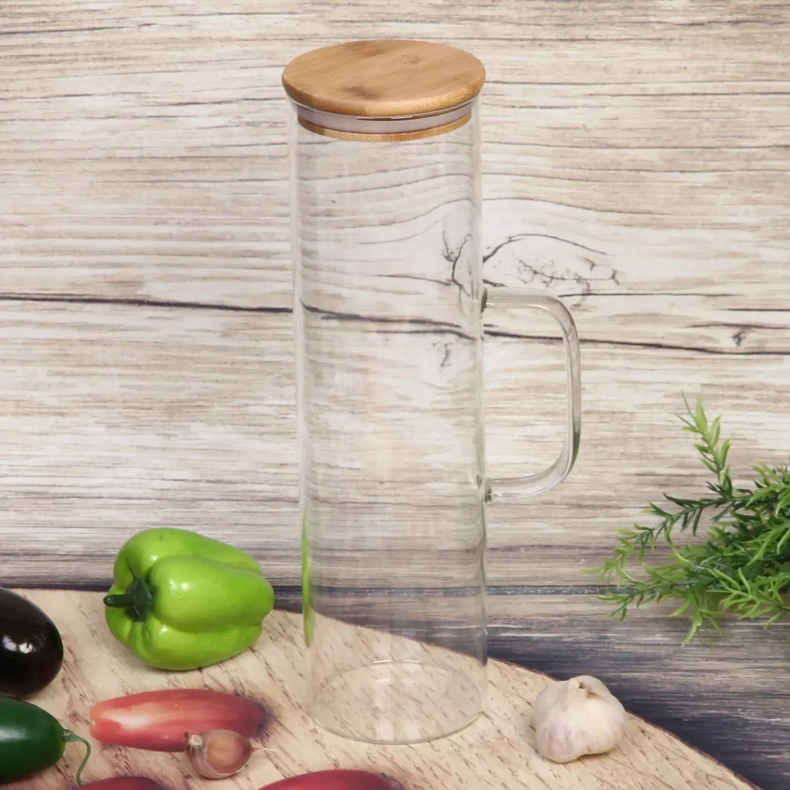 Цилиндрическая форма и прозрачные стенки позволяют легко контролировать количество содержимого. Бамбуковая крышка с плотной посадкой обеспечивает полную герметичность, а эргономичная ручка делает использование максимально удобным.