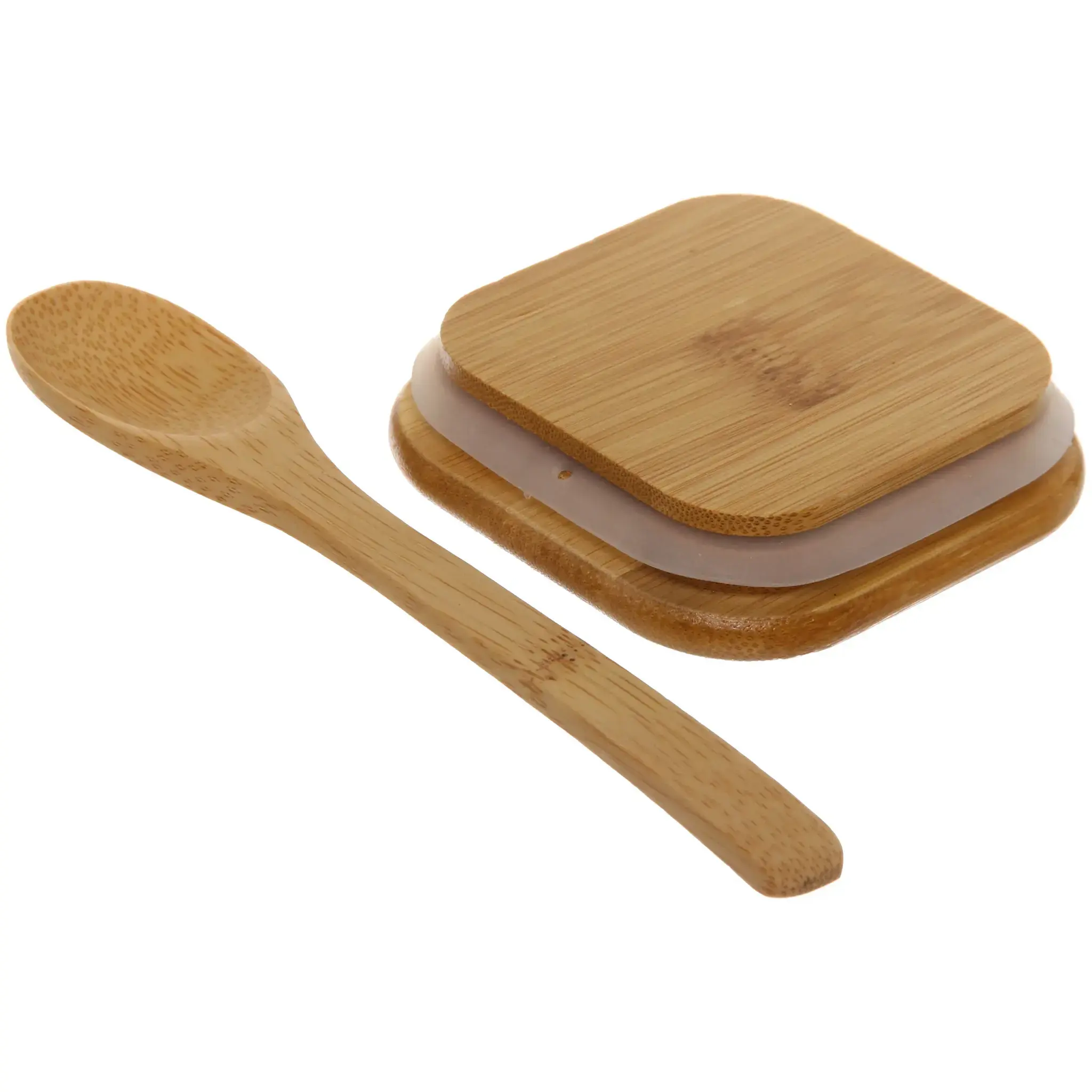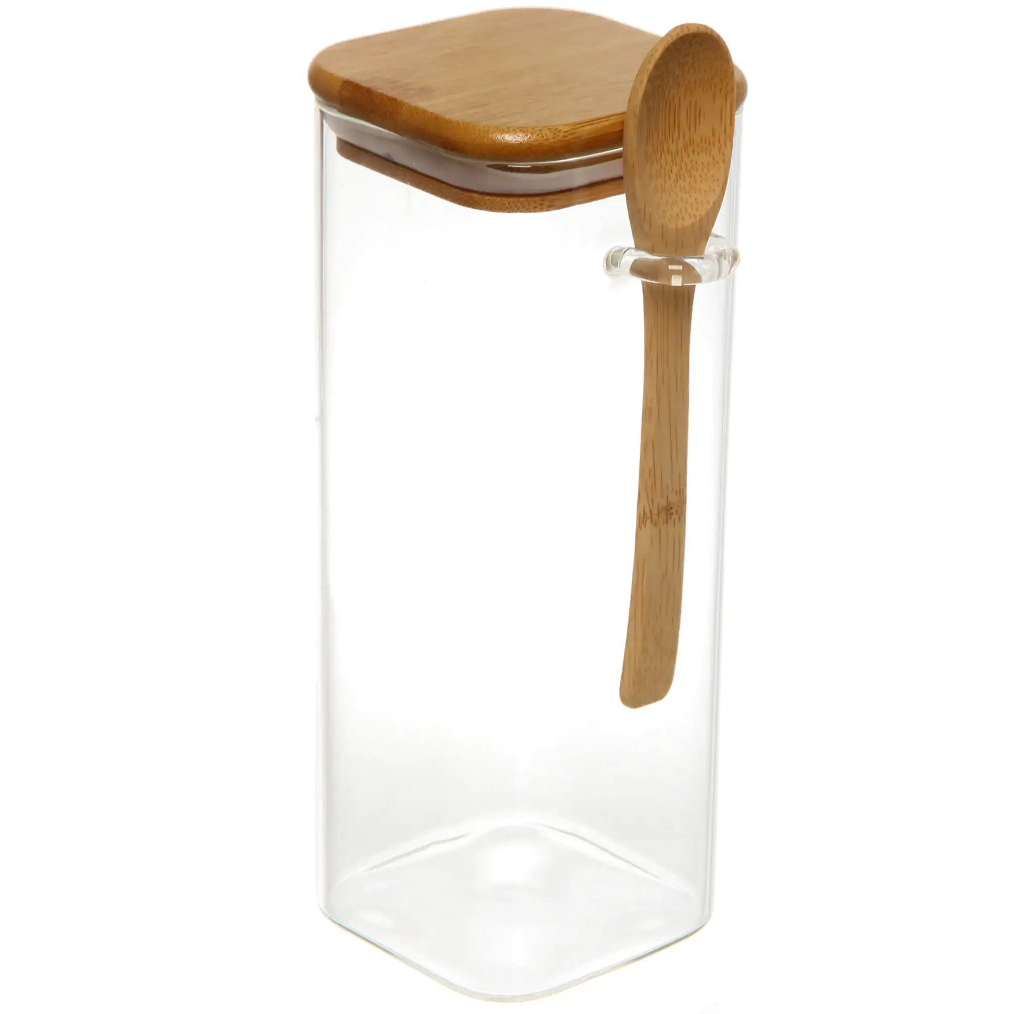 Банка предназначена для хранения различных продуктов, будь то сыпучие ингредиенты, специи или даже сладости. Бамбуковая крышка плотно закрывает ёмкость, сохраняя свежесть и аромат содержимого. Деревянная ложка, прикреплённая к банке, всегда под рукой, что делает её использование ещё более практичным.