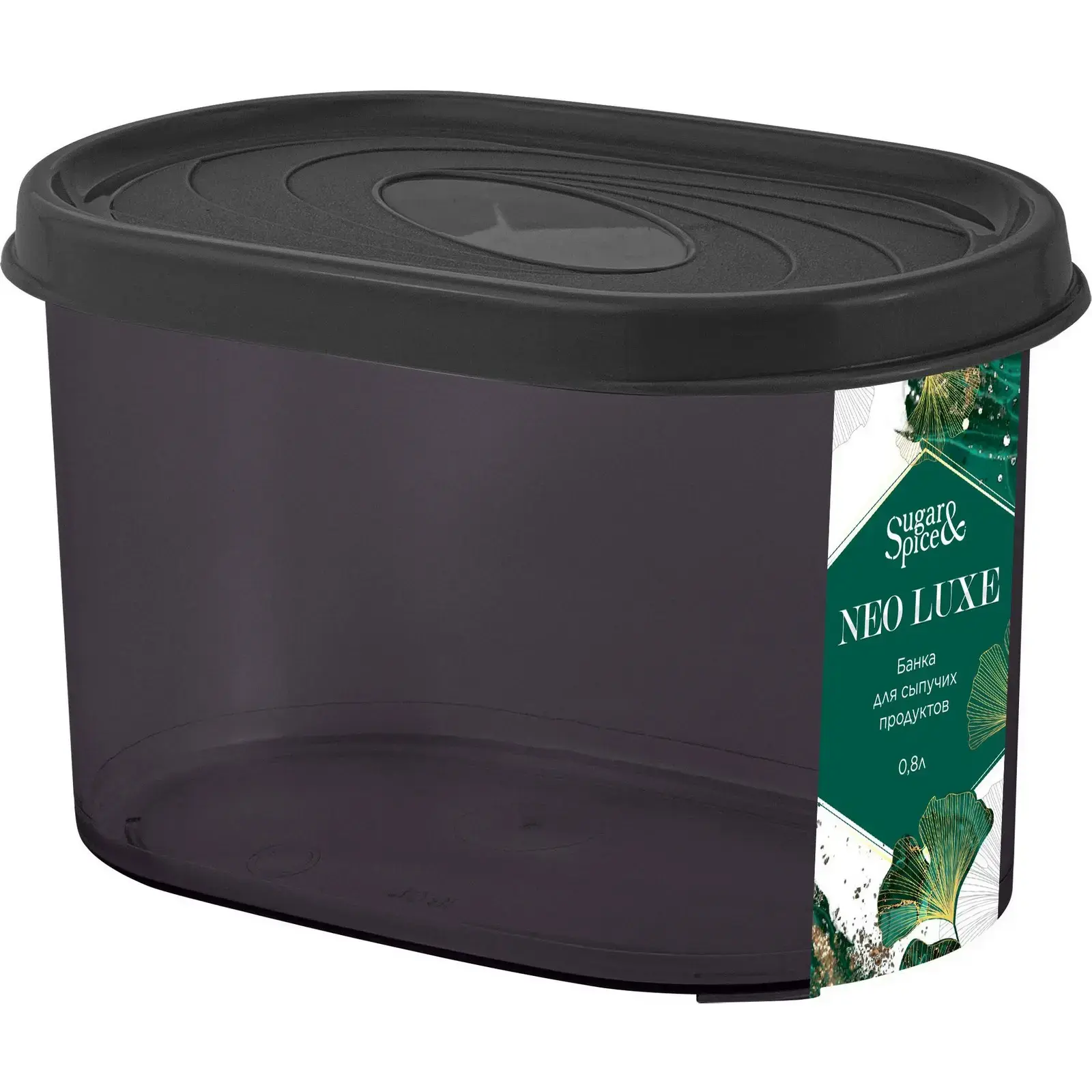 Объем банки составляет 0,8 литра, что делает ее достаточно вместительной для хранения различных продуктов. Корпус выполнен из качественного пластика, а крышка имеет гладкую поверхность с углублением для удобного открытия. Этикетка с названием «Sugar & Spice NEO LUXE» и растительными мотивами добавляет изюминку в дизайн.