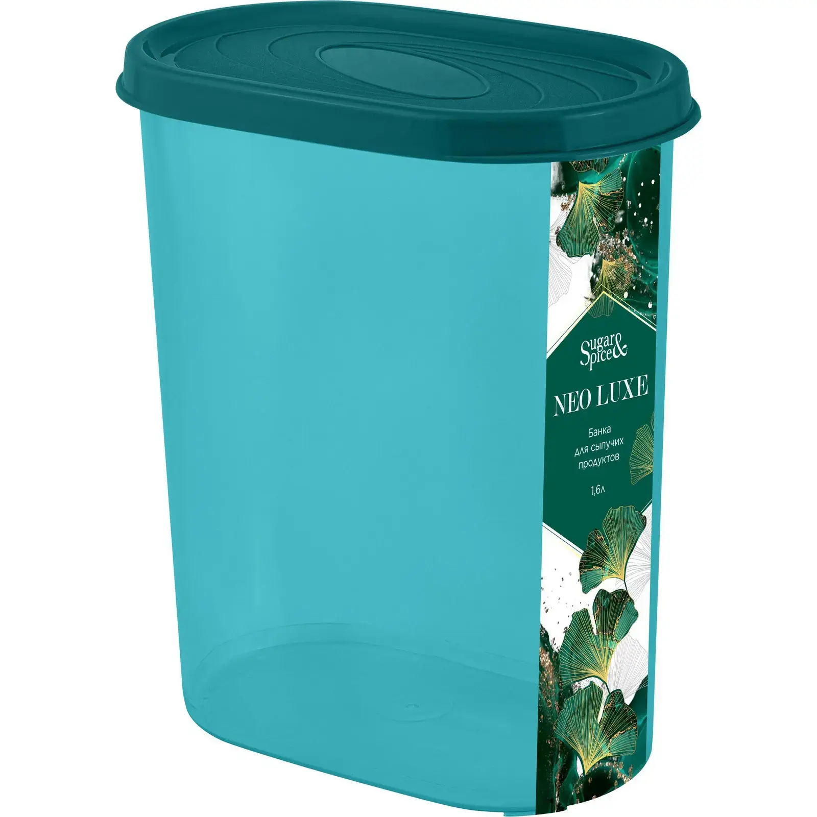 Банка выполнена из прочного пластика, что делает ее легкой и устойчивой к повреждениям. Цвет корпуса — светло-голубой, а крышка — темно-зеленая, что создает гармоничное сочетание. Этикетка с названием «NEO LUXE» и изображениями листьев добавляет природный акцент в дизайн. Размеры банки позволяют удобно размещать ее в шкафах и на полках.