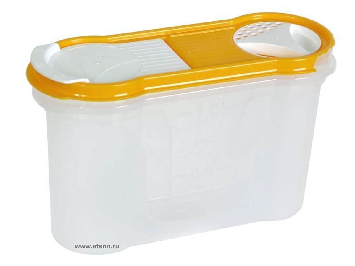 Преимущества: компактный размер 1,3 л, изготовлен из прочного и безопасного полипропилена, устойчив к механическим повреждениям и легко моется. Благодаря прозрачности легко отслеживать запасы — забудете о лишних покупках.