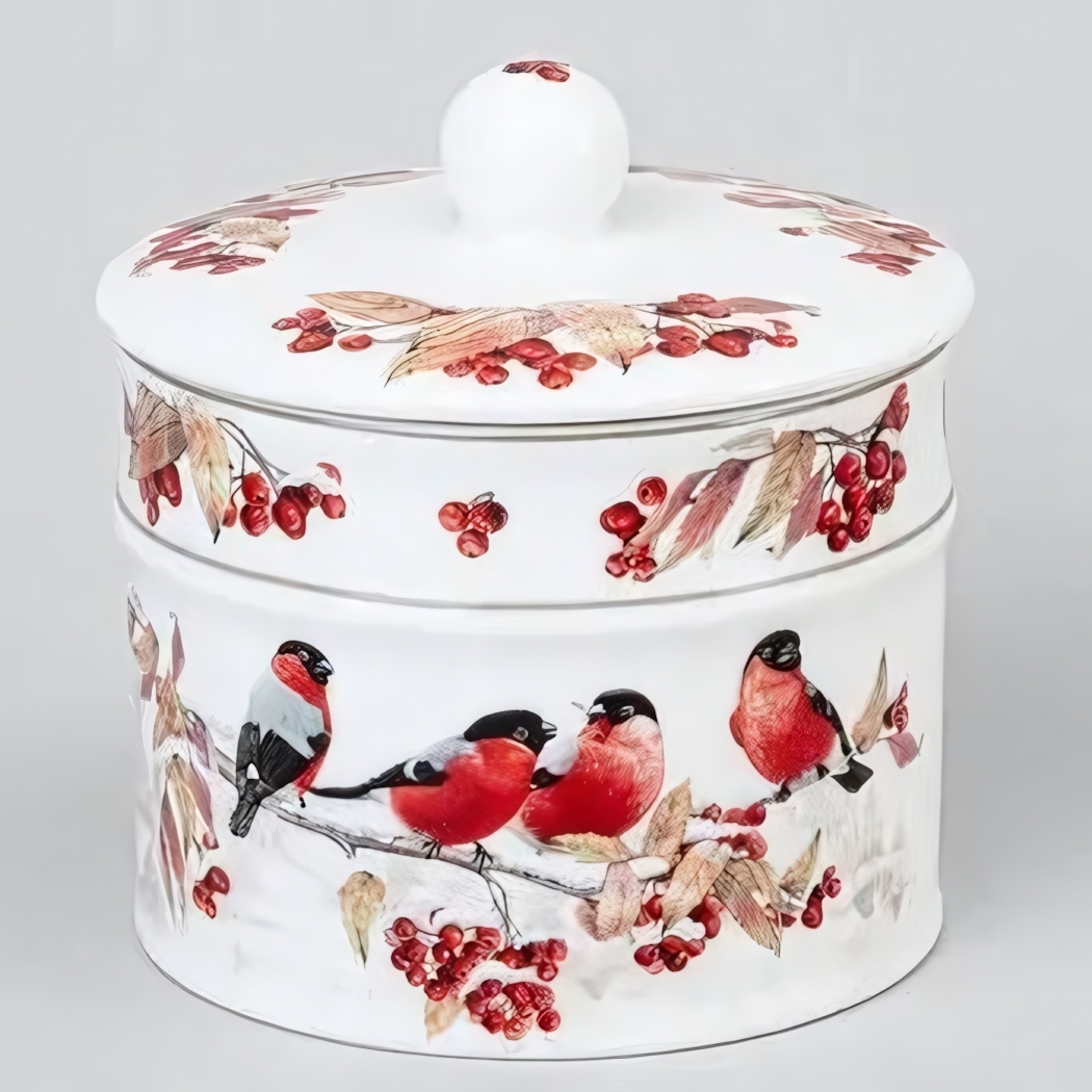 Эта изысканная фарфоровая банка из коллекции «Снегири» станет не только удобным, но и стильным предметом на вашей кухне. Её яркий зимний рисунок с красногрудыми птицами и ветками с ягодами создаёт атмосферу уюта и праздника, а компактный размер позволяет удобно хранить в ней чай, кофе, орехи, сладости или пряности.