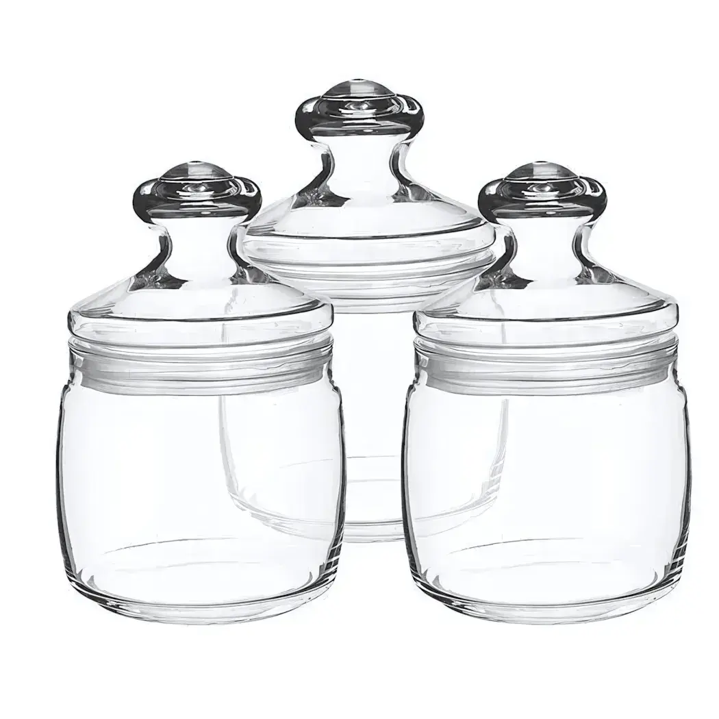 Три практичные банки с герметичными крышками — идеальное решение для кухни, кладовой или творческой мастерской. Стеклянные ёмкости сохраняют свежесть сыпучих продуктов, специй и домашних заготовок, а оригинальный дизайн станет украшением интерьера.