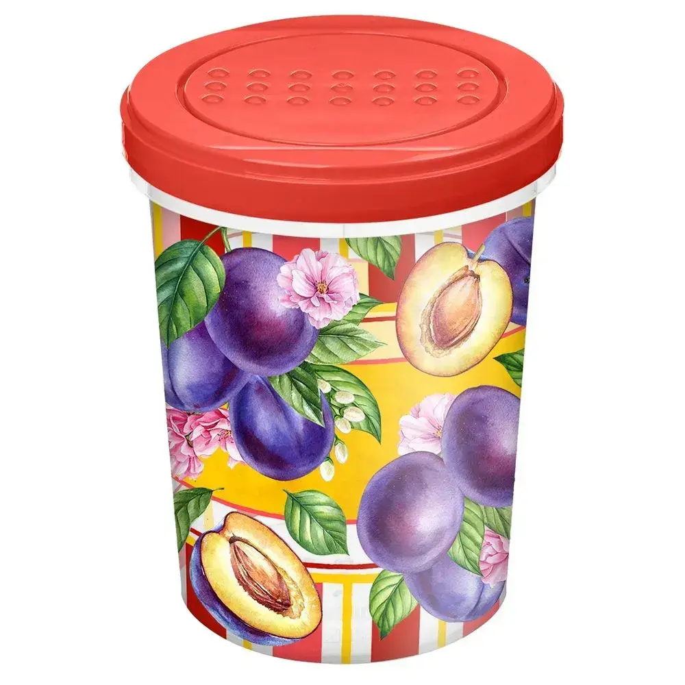 Объём — 1 литр, материал — пластик, крышка завинчивающаяся, цвет крышки — красный, декор "Сицилия" с мотивами фруктов и цветов на ярком фоне. Рекомендуется использовать для хранения сухих ингредиентов. Банка легко очищается вручную, устойчива к перепадам температуры в бытовых условиях.