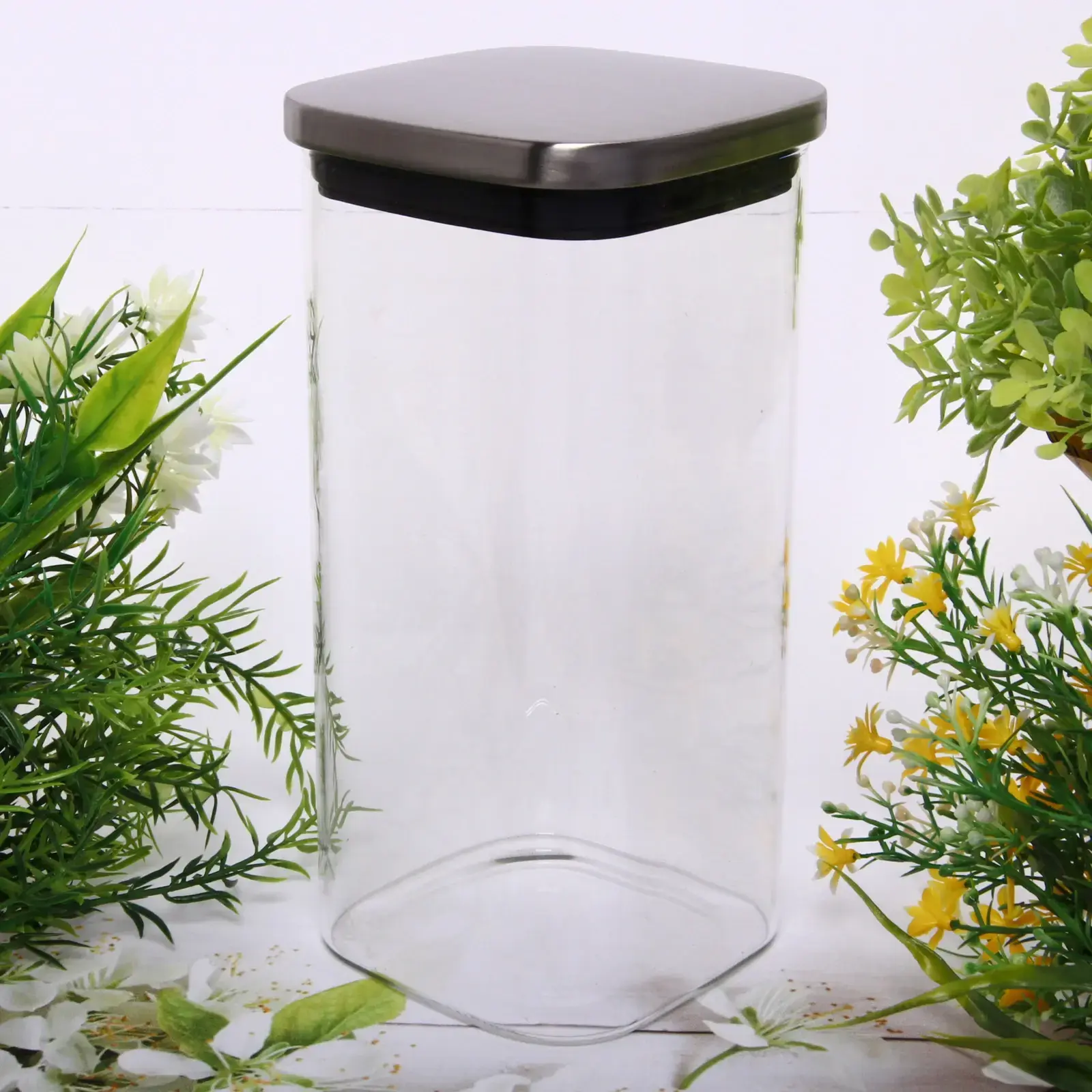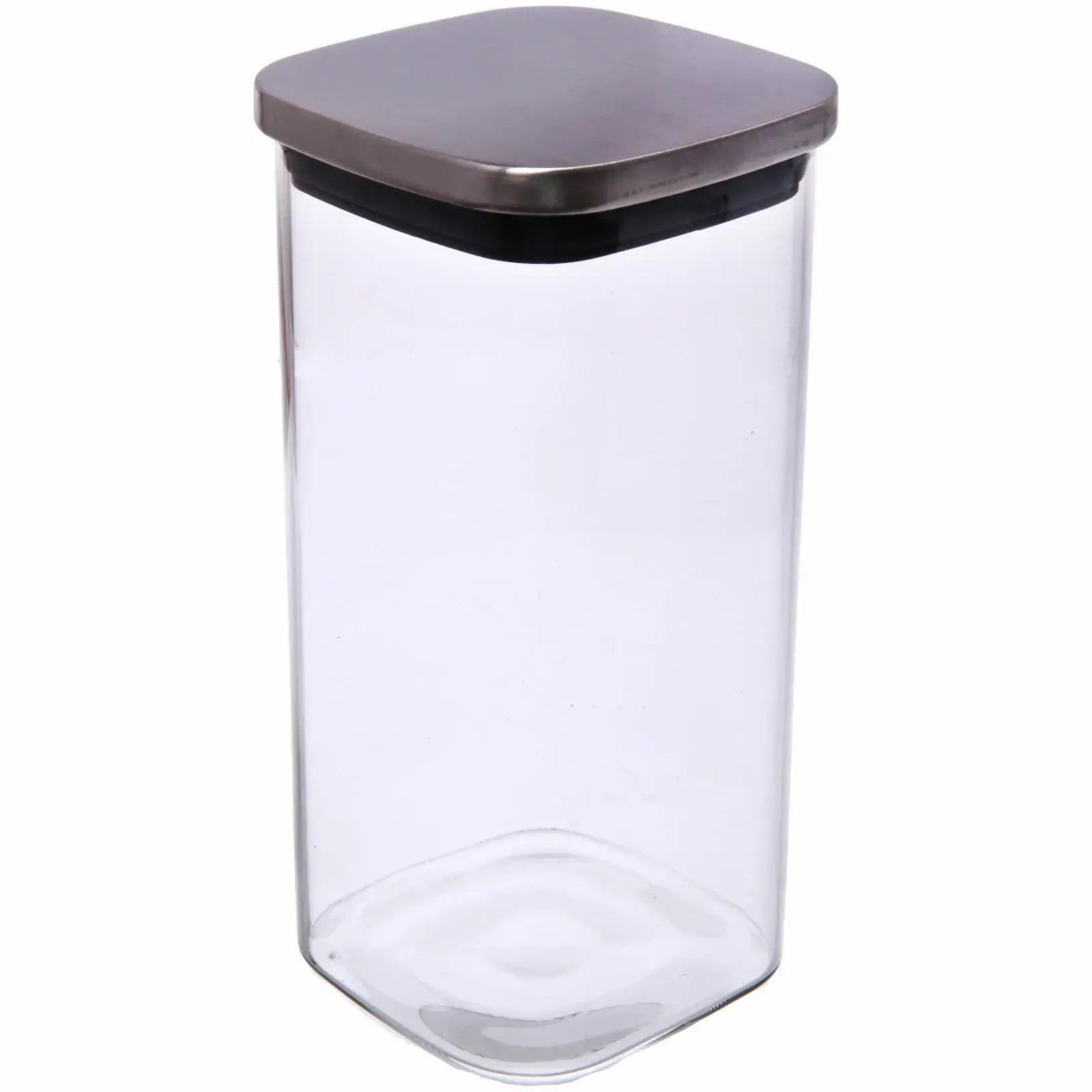 Объём 1400 мл оптимален для хранения стандартных запасов. Сочетание закалённого стекла с металлическим креплением гарантирует долговечность даже при активной эксплуатации. Прямоугольная форма с закруглёнными углами позволяет компактно разместить банку на полке или в шкафу.