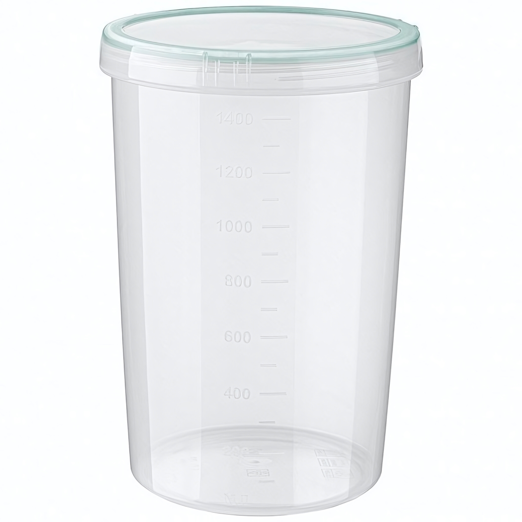 Главная особенность модели — герметичная винтовая крышка с эластичным светло-голубым уплотнителем. Она плотно прилегает к корпусу, надежно защищая содержимое от посторонних запахов и влаги. Вы можете быть уверены: даже при транспортировке продуктов крышка останется на месте и ничего не прольется. Прозрачный корпус позволяет мгновенно найти нужный ингредиент, а четкая рельефная мерная шкала до 1400 мл поможет точно определить объем остатков.