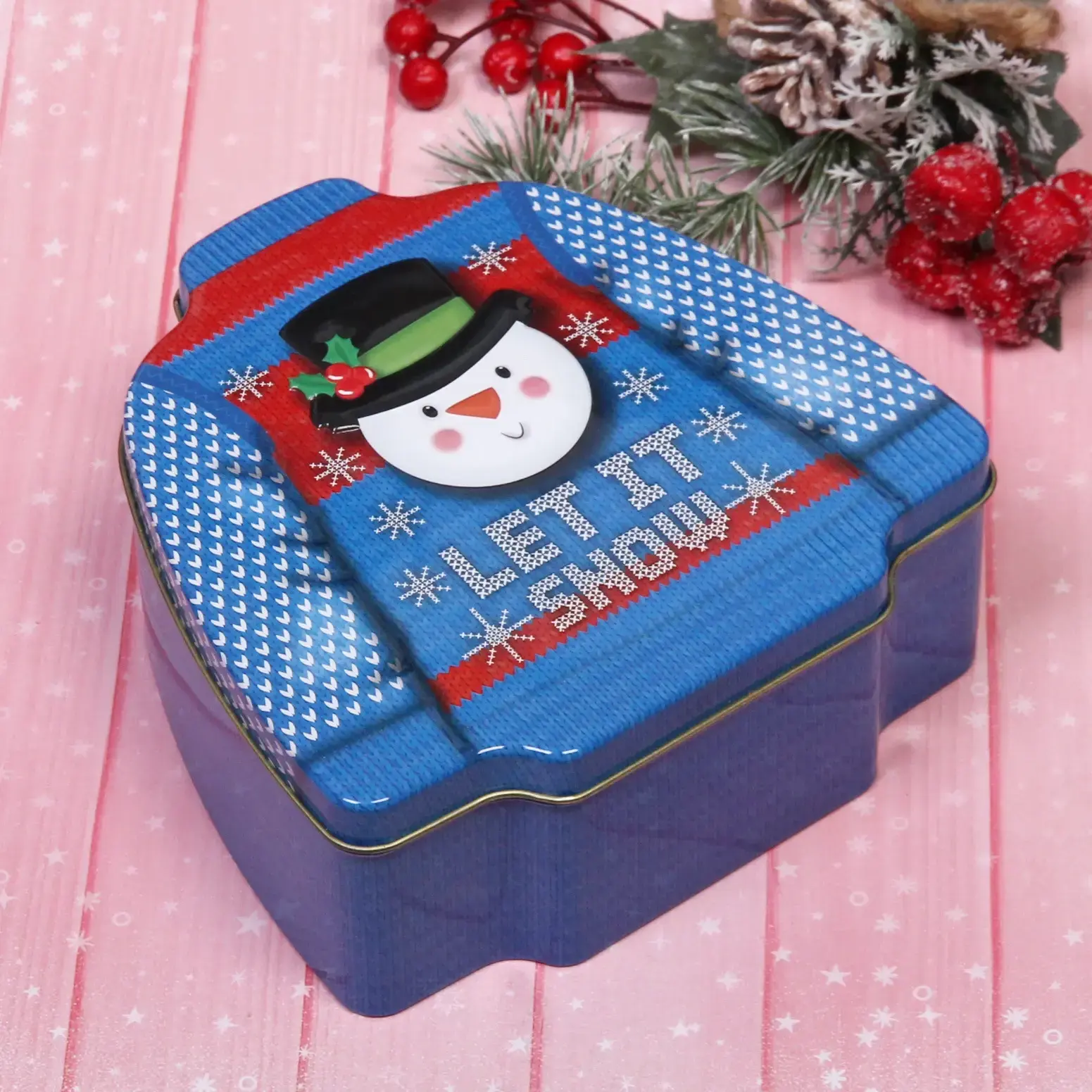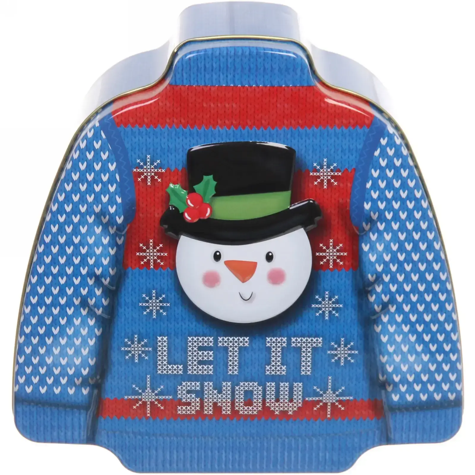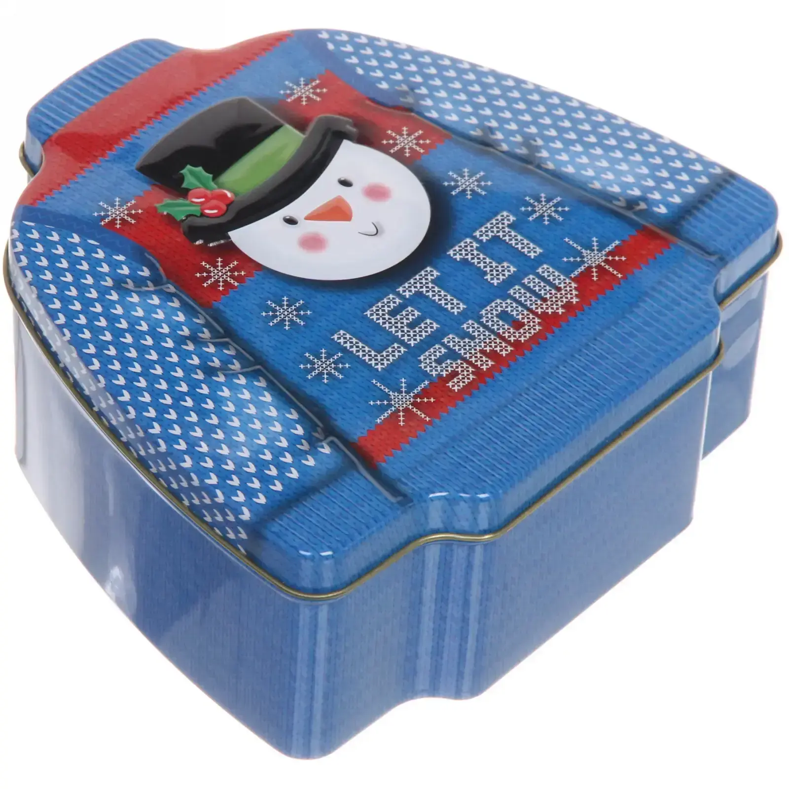Новогодняя упаковка банка жестяная «Свитерок» Снеговик, 16,5х16,5х3,7см, голубая с рисунком