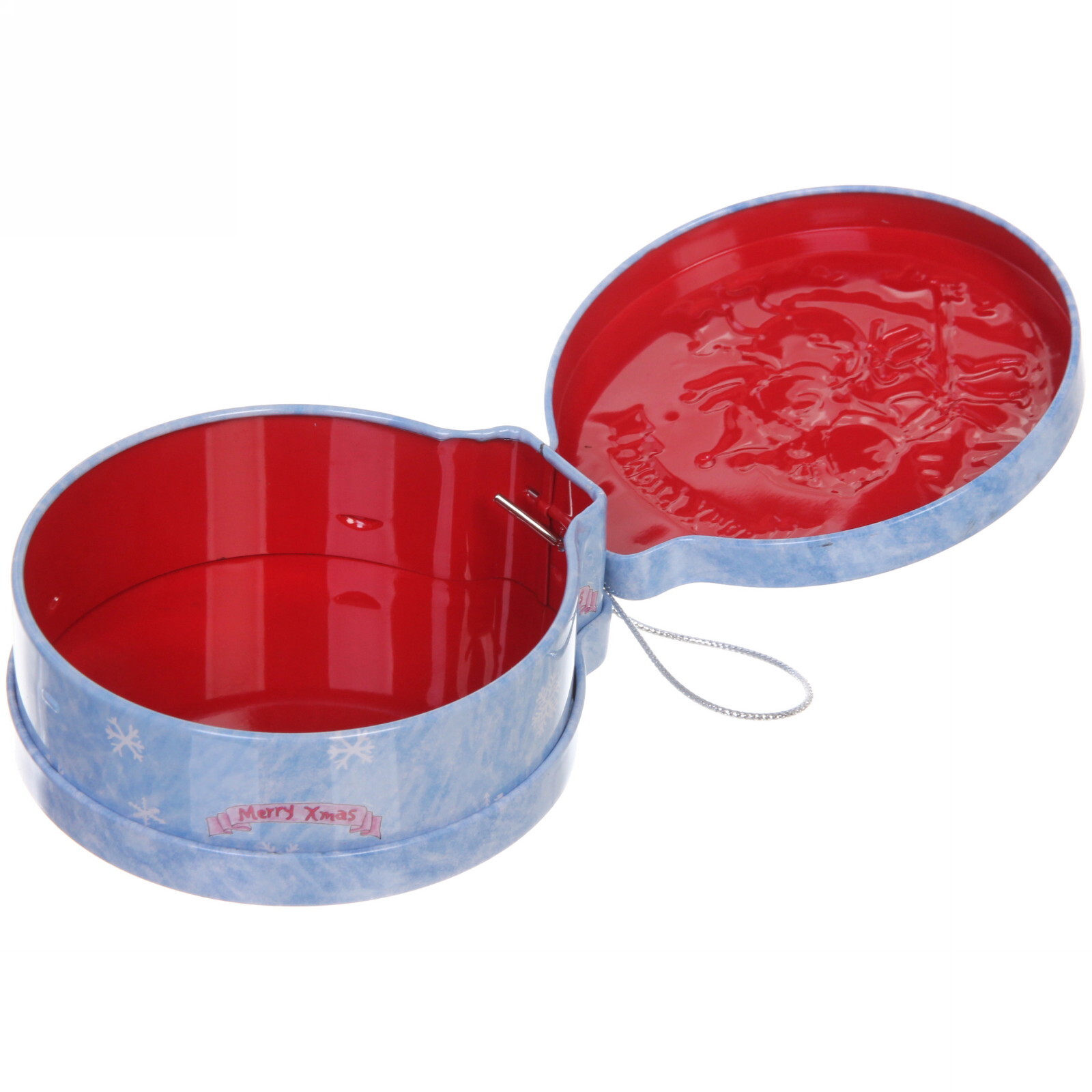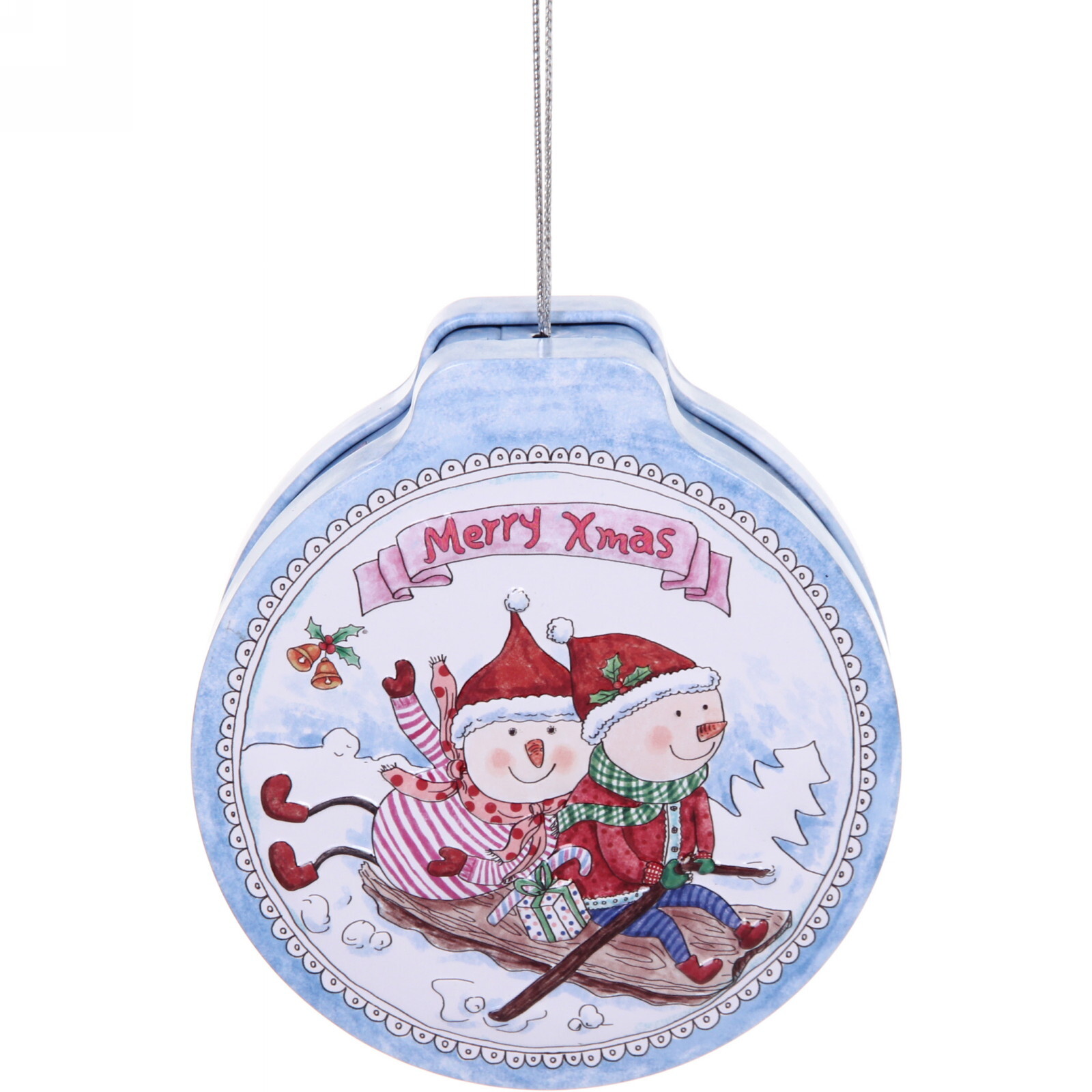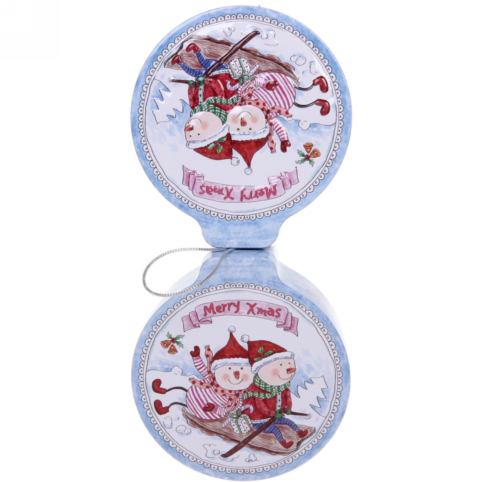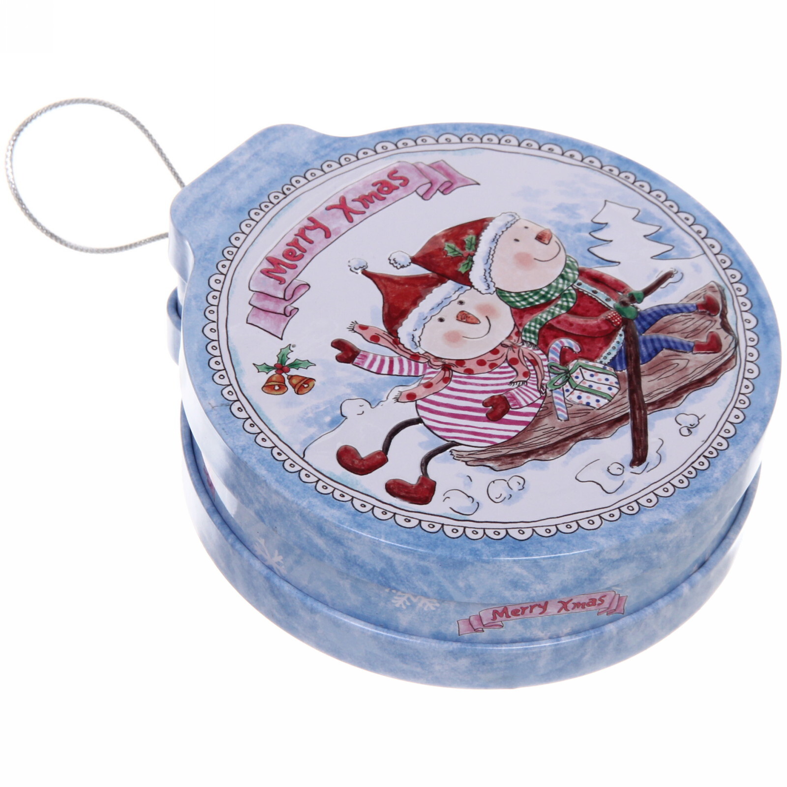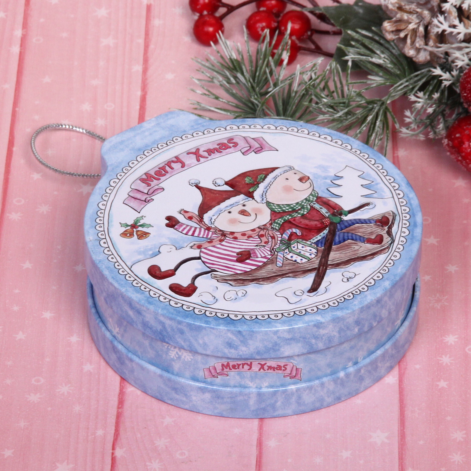 Новогодняя упаковка банка жестяная 200мл, дизайн «Снеговики на санках», 11,2х12,2х4см