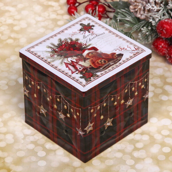 Эта жестяная банка станет идеальным решением для упаковки подарков на Новый год. Она не только практична, но и добавляет атмосферу праздника благодаря своему яркому дизайну. Размеры 9х9х9 см позволяют упаковать в неё не только сладости, но и другие небольшие подарки, что делает её универсальным аксессуаром для любого торжества.