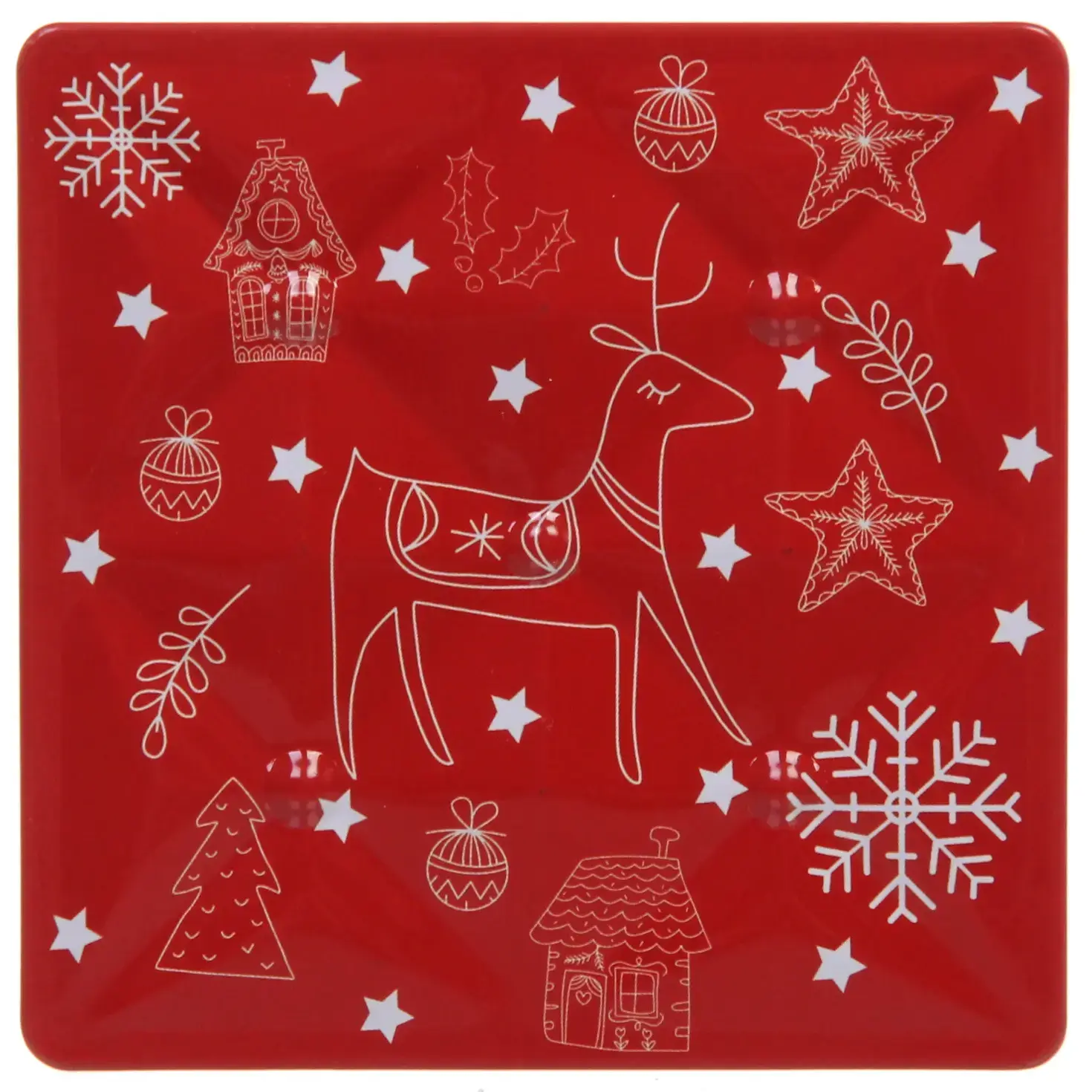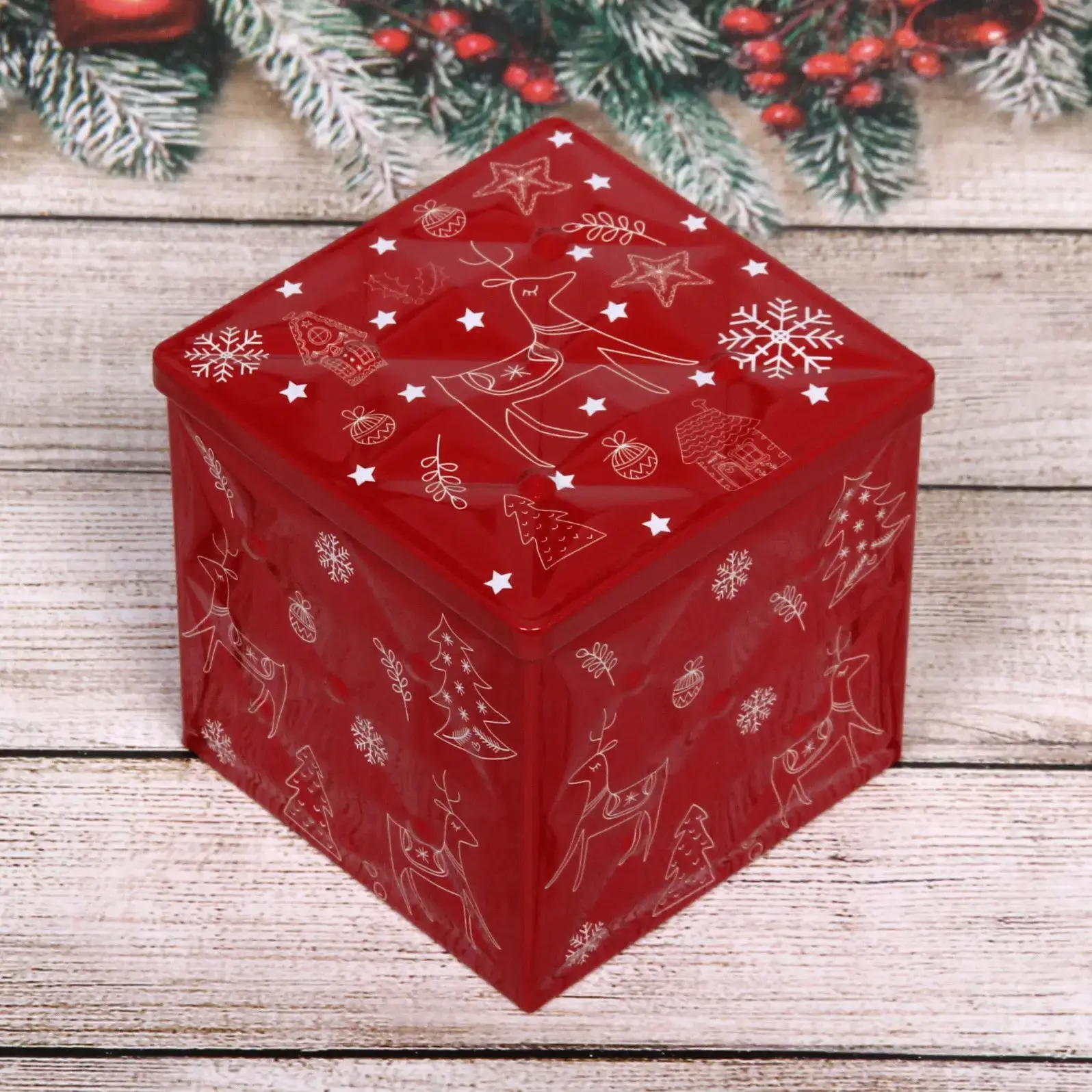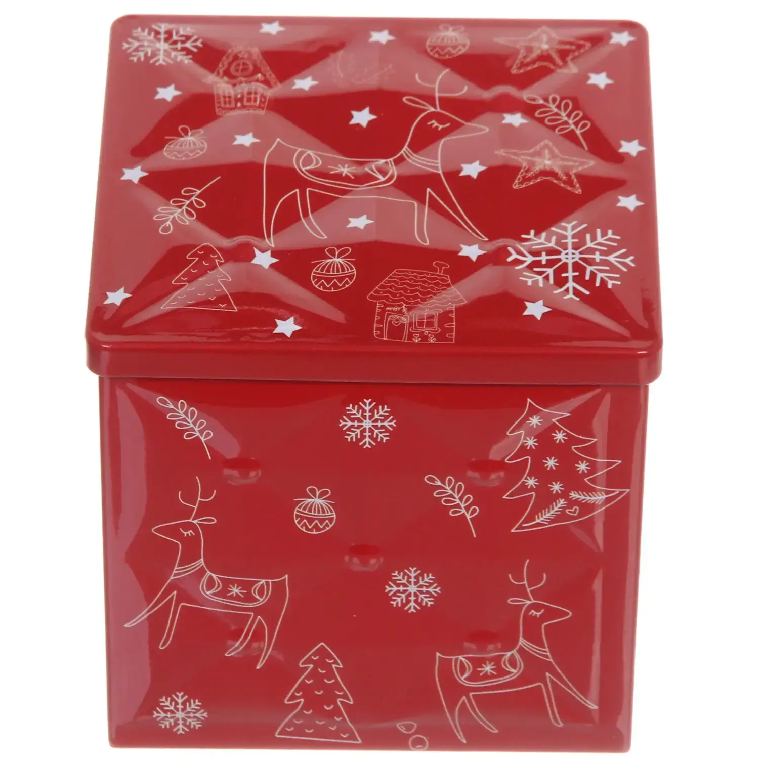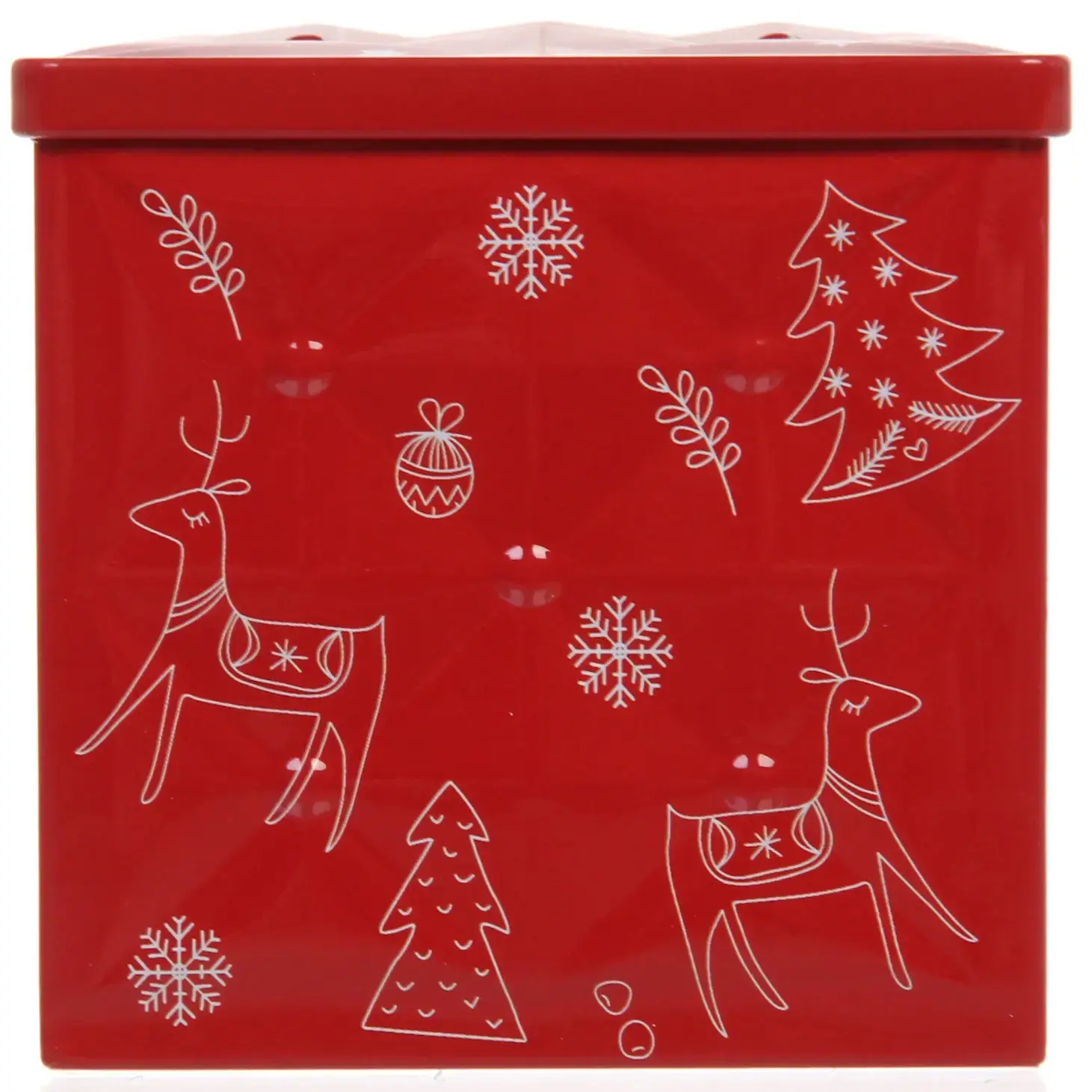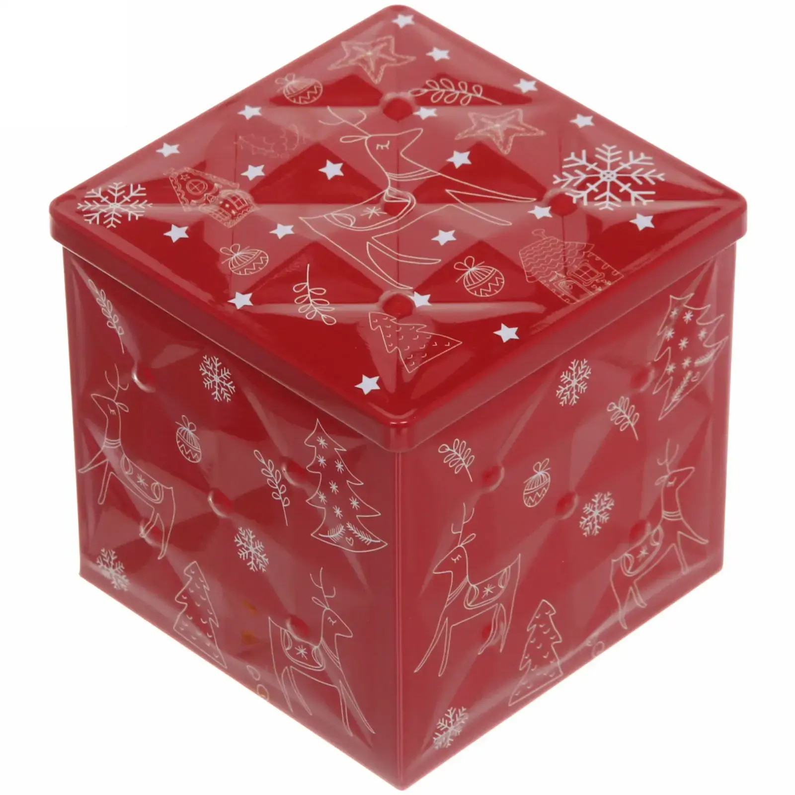 Эта яркая жестяная банка станет идеальным решением для упаковки сладостей и небольших подарков на Новый год. С её помощью вы сможете создать атмосферу праздника и порадовать близких оригинальным знаком внимания. Красный цвет и новогодний дизайн с изображениями снежинок, оленей и ёлок делают её не только практичной, но и стильной.