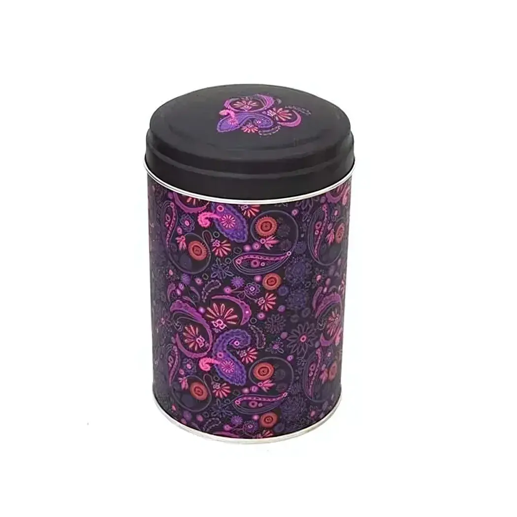Цвет лиловый с разнообразными оттенками — орнамент нанесён по всей поверхности, крышка черная с совпадающим декоративным рисунком. Материал — жесть (тонкий металл). Банка предназначена для хранения пищевых и не пищевых продуктов в домашних условиях.