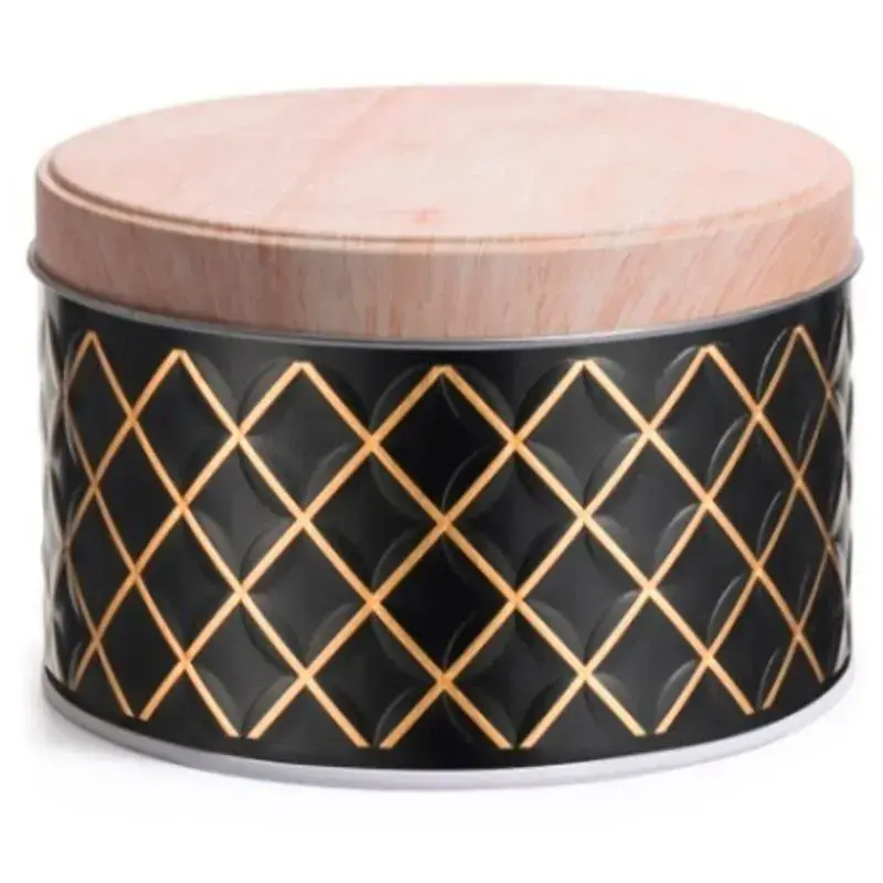 Элегантная жестяная банка с деревянной крышкой — практичное решение для хранения чая, кофе, специй и других сыпучих продуктов. Декоративный золотой орнамент на чёрном фоне добавит изысканности вашим кухонным полкам.