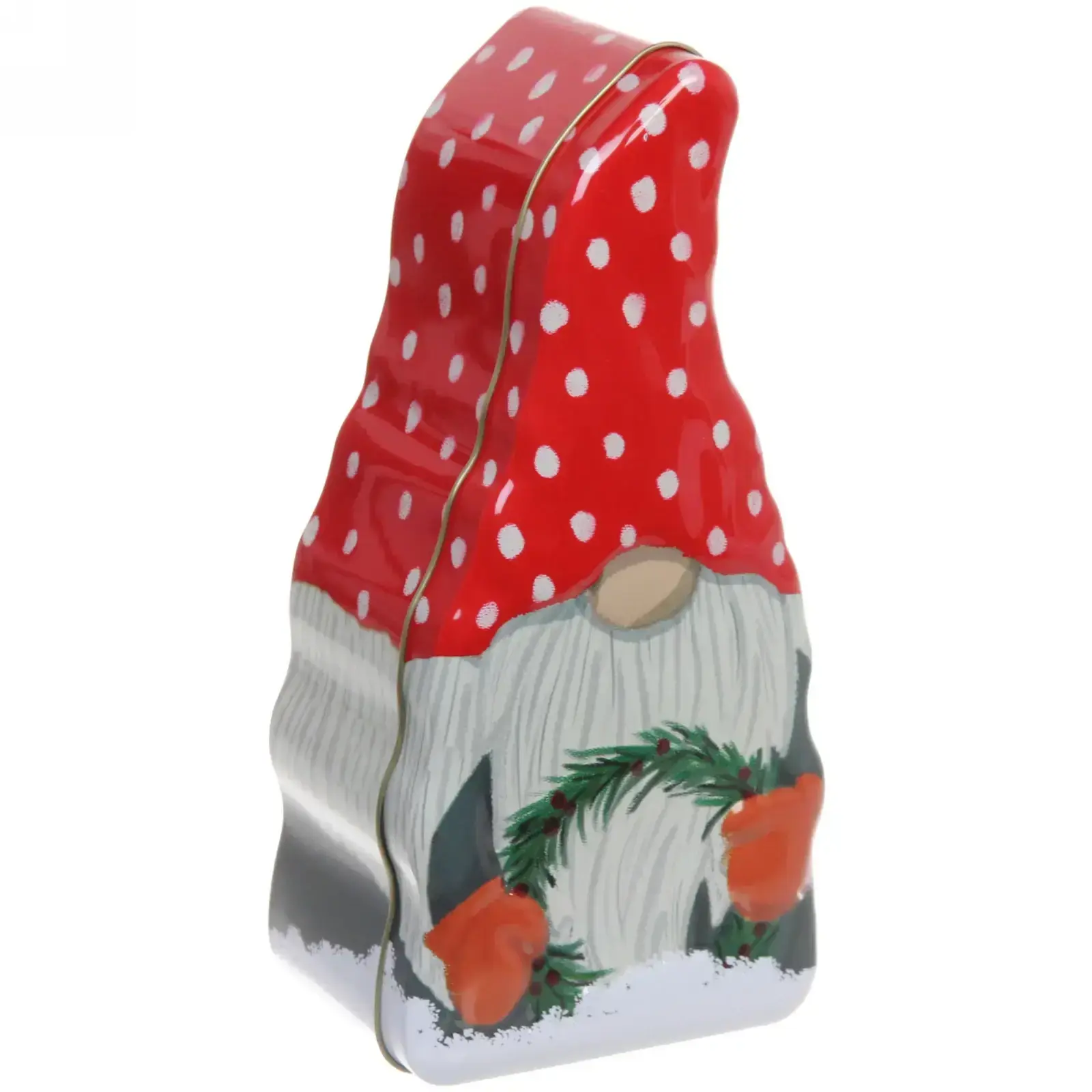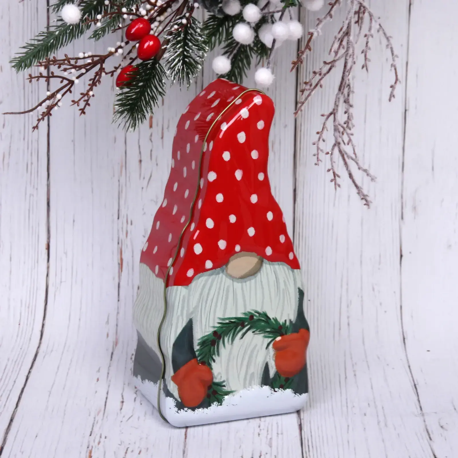 Подарите своим близким радость с жестяной банкой «Гномик с венком». Этот оригинальный контейнер станет не только стильным элементом декора, но и практичным решением для упаковки сладостей и небольших подарков на Новый год. Яркий дизайн в виде гнома с красной шапкой и белыми горошками создаст праздничное настроение и украсит любой стол.