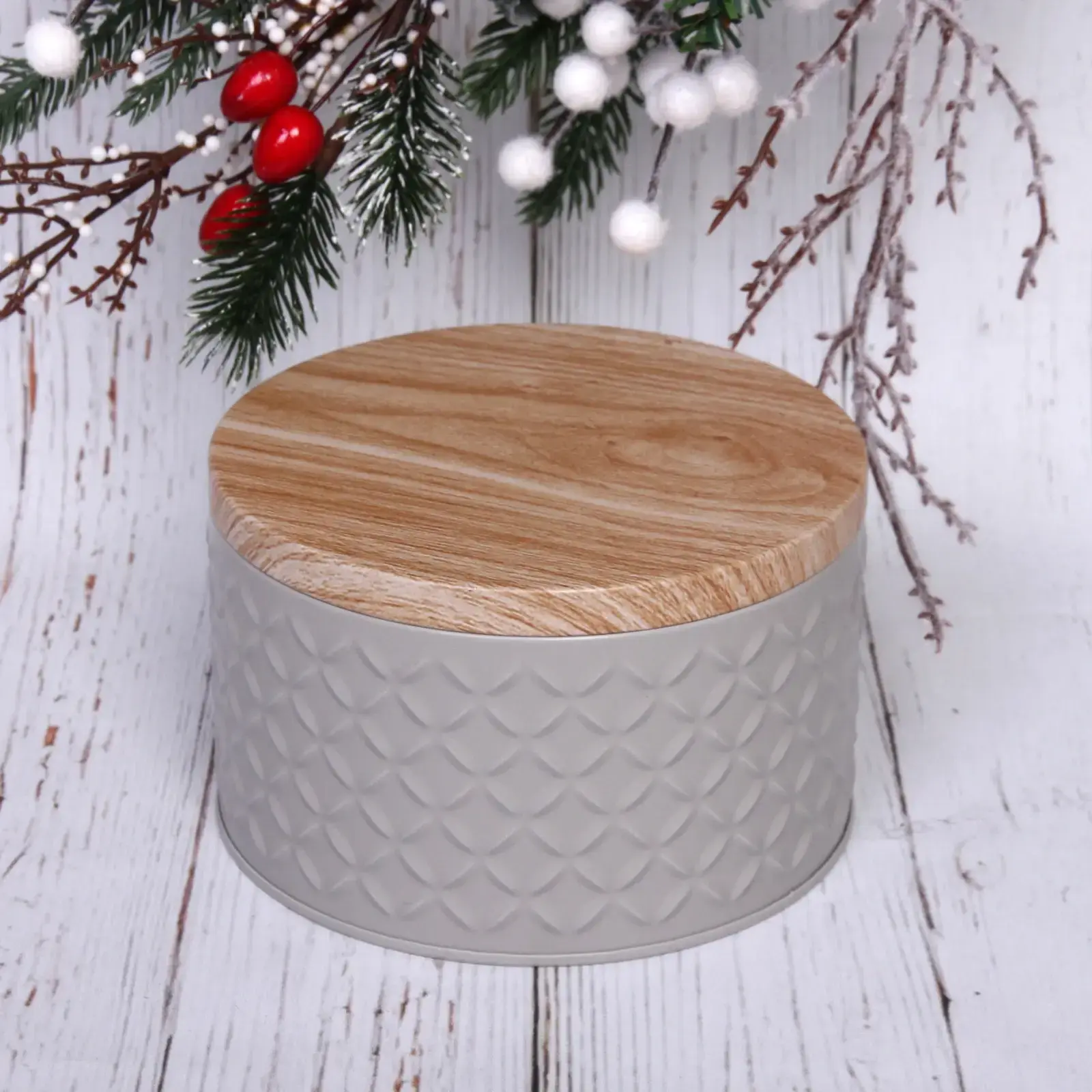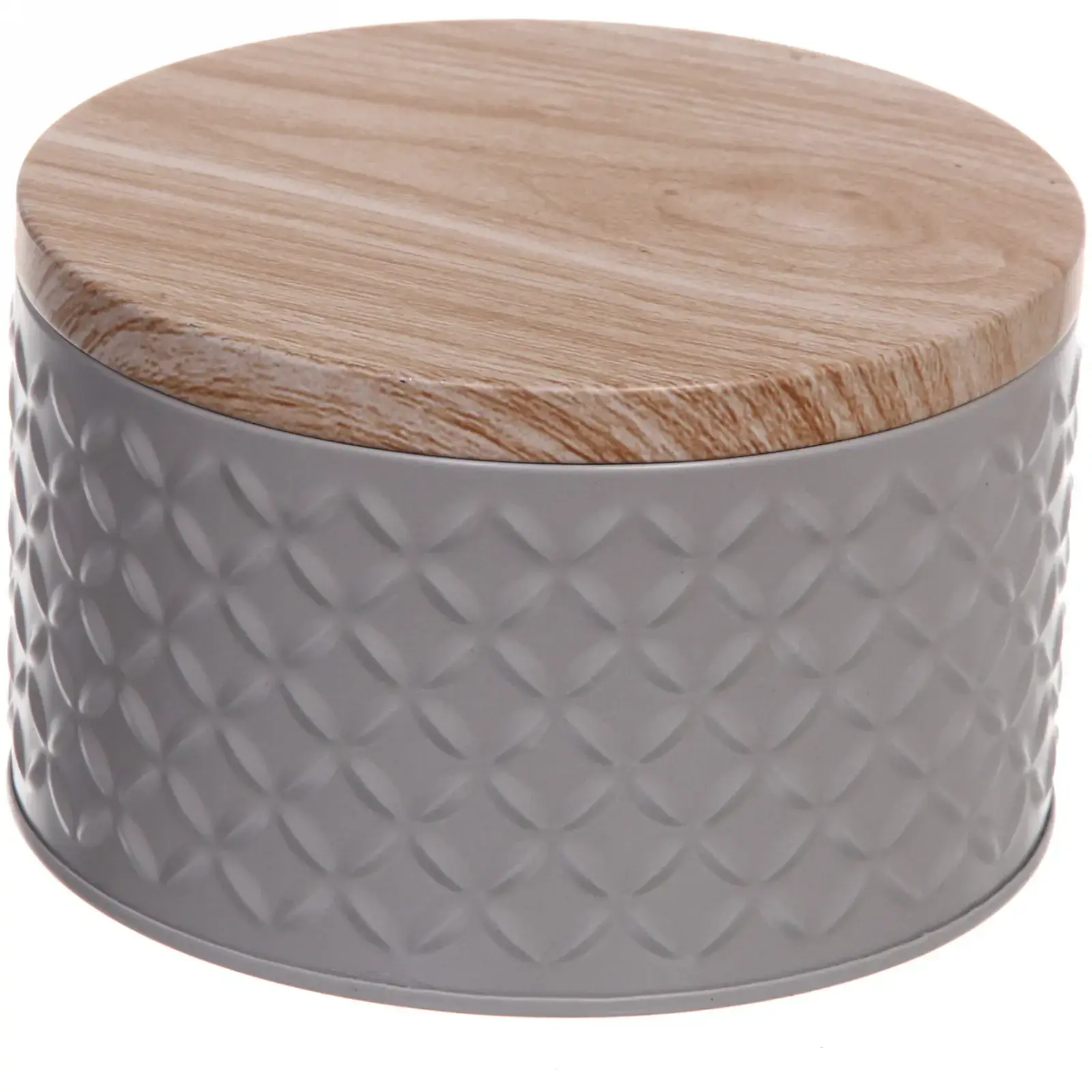 Почему стоит выбрать именно эту банку? Во-первых, она изготовлена из качественной жести, что обеспечивает долговечность и надежность. Во-вторых, её стильный серый цвет и текстурированная поверхность с рельефным узором придают ей уникальный вид, который легко впишется в любой интерьер. Крышка, выполненная из материала, имитирующего дерево, добавляет естественности и тепла в ваш дом.