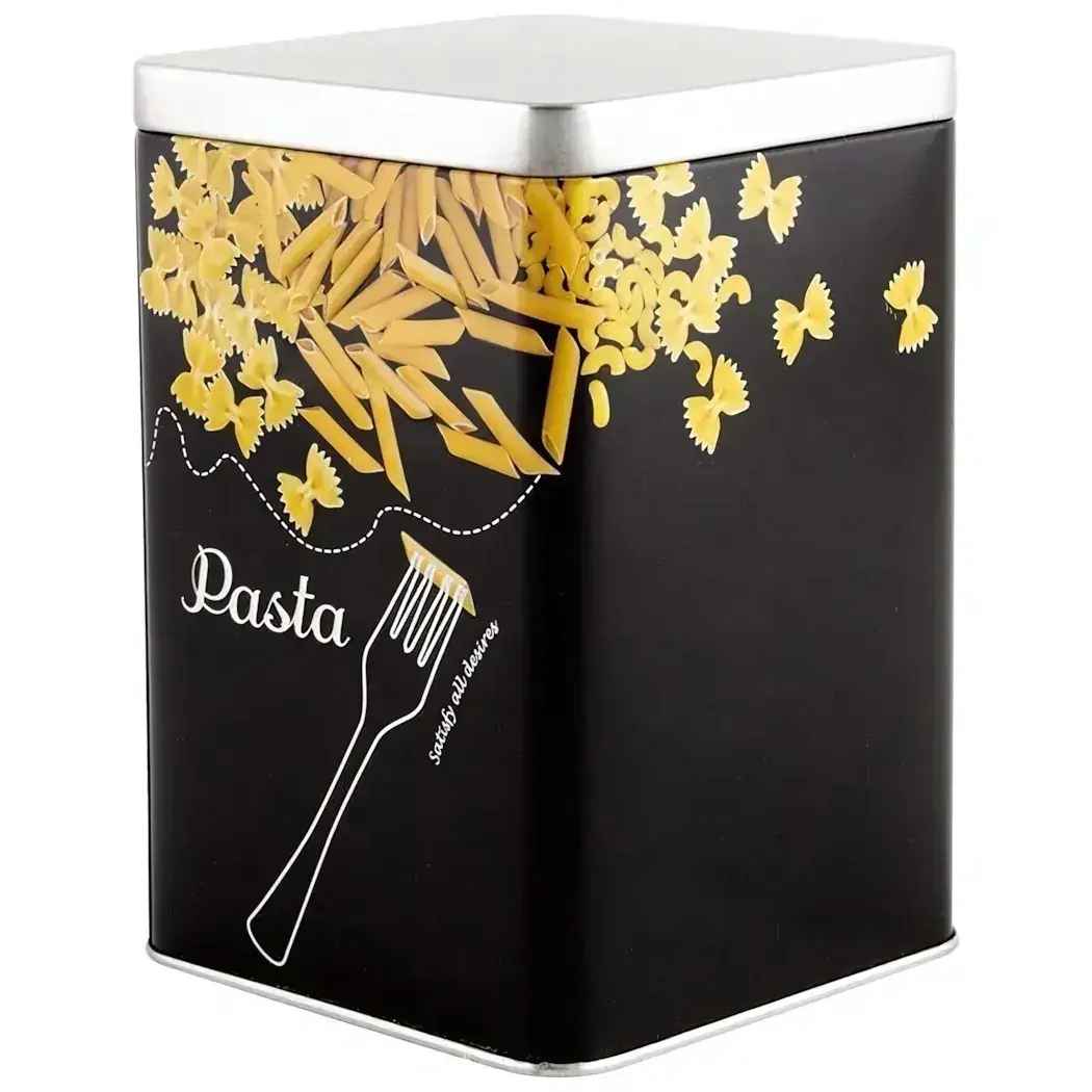 Банка жестяная квадратная с крышкой 1 л, для хранения макарон, черный с рисунком пасты