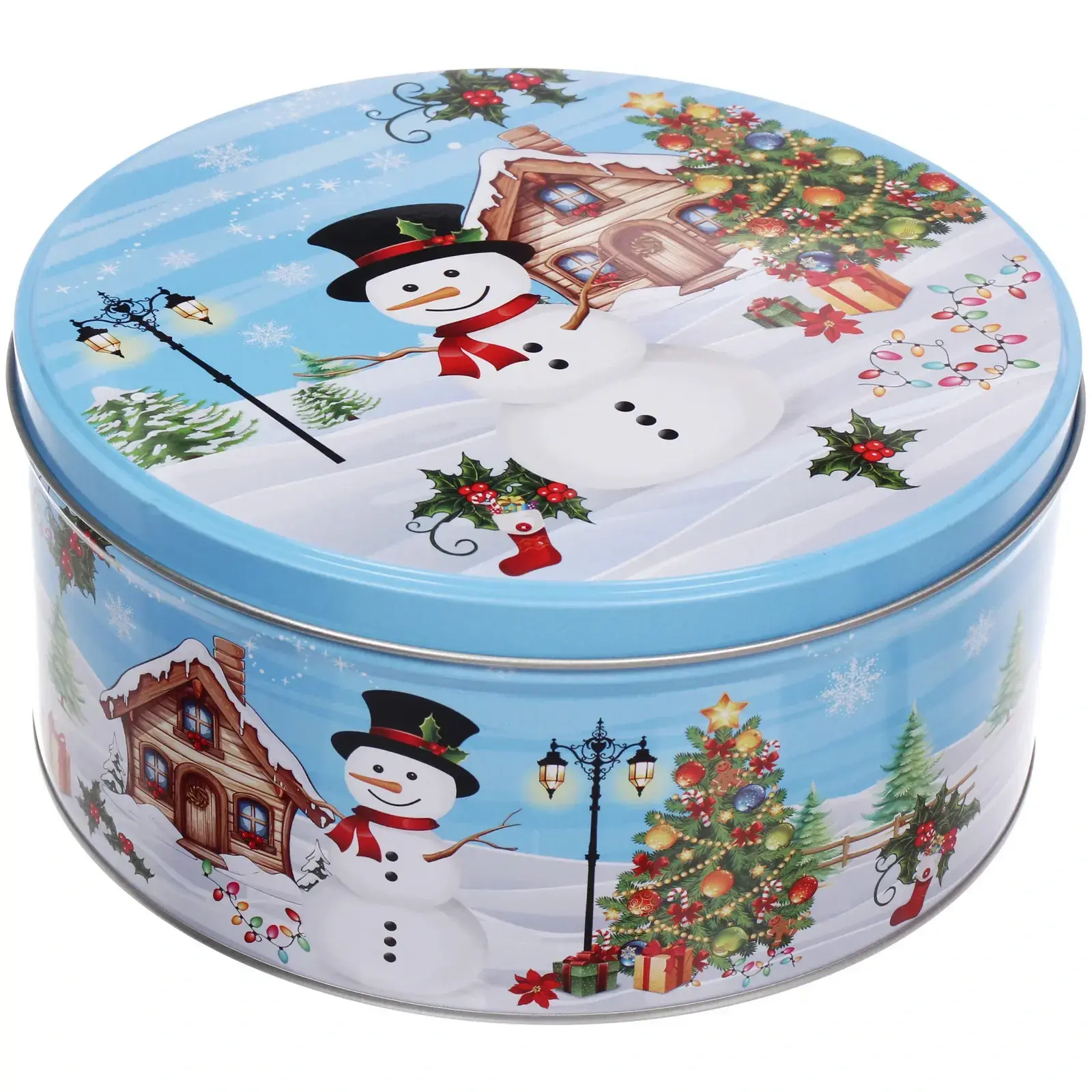 Праздничная жестяная банка с рисунком «сказочный снеговик» создаёт уют и атмосферу торжеств, а её декоративный дизайн превращает обычную упаковку в стильный подарок для семьи и друзей.