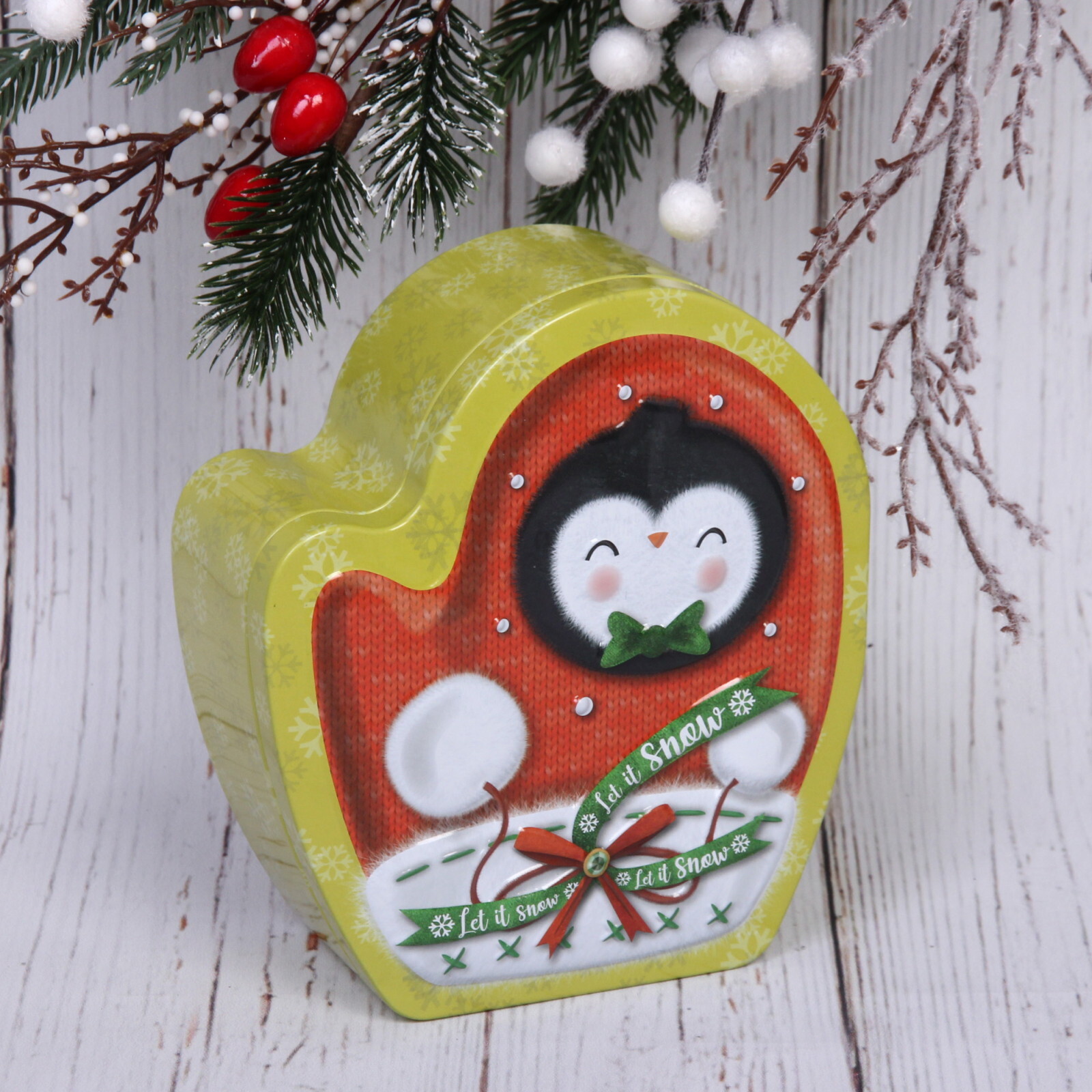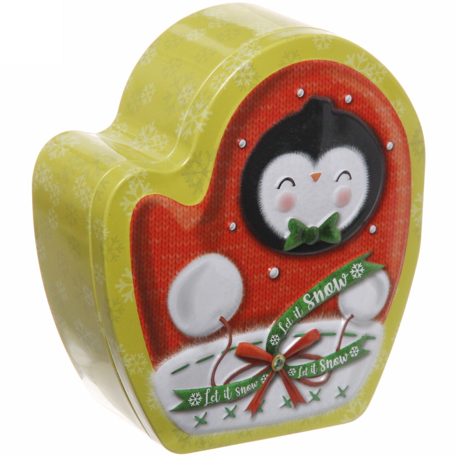 Создайте волшебство зимних праздников с жестяной банкой в форме варежки! Яркий дизайн с улыбающимся пингвином и снежинками превратит обычный подарок в запоминающийся сюрприз.