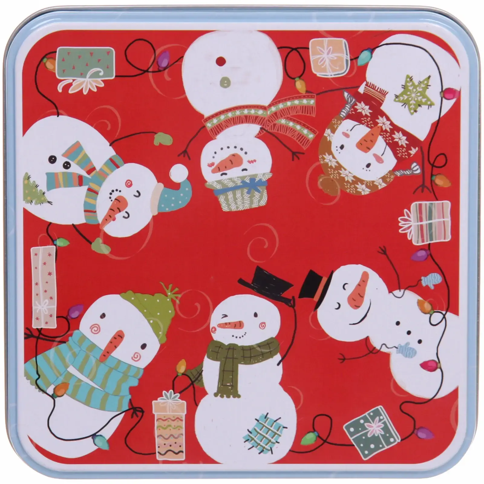 Банка выполнена в красном цвете с декоративным рисунком снеговиков, что делает ее идеальной для зимних праздников. Крышка светло-голубого цвета добавляет контраста и делает упаковку еще более привлекательной. Размеры банки 15х15х7 см, что позволяет удобно хранить ее на полке или под елкой.