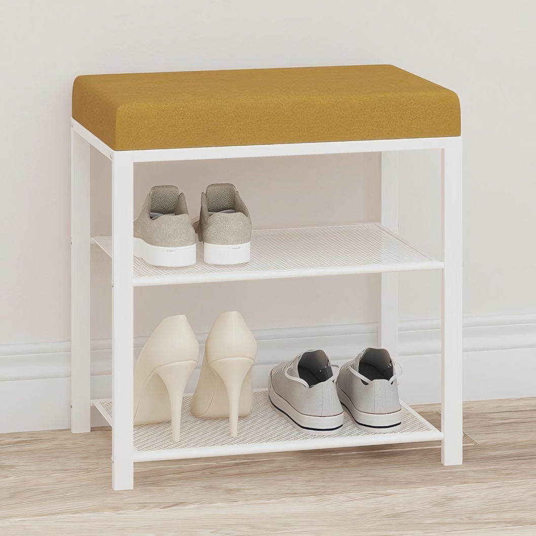 Белый металлический каркас гармонично сочетается с горчичным сиденьем, добавляя интерьеру тёплый акцент. Банкетка легко вписывается в светлые и контрастные пространства, делая прихожую более уютной и организованной.
