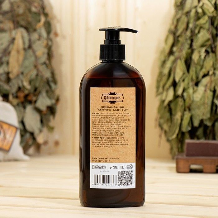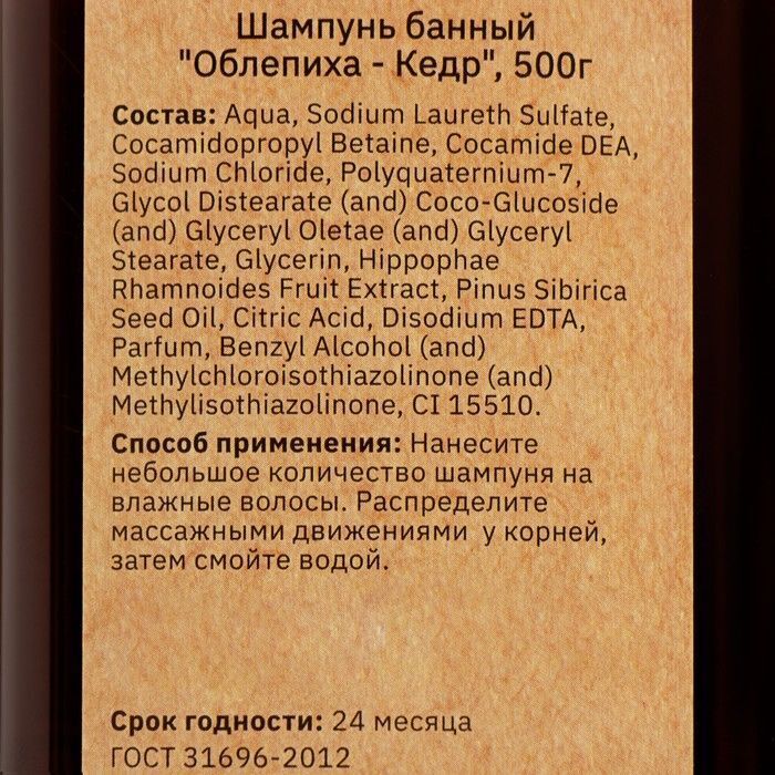 Упаковка шампуня выполнена из темного пластика, что защищает содержимое от воздействия света. Дозатор позволяет удобно использовать продукт, не допуская его перерасхода. Срок годности составляет 24 месяца, что гарантирует длительное использование без потери качества. Наслаждайтесь каждым моментом ухода за собой с банным шампунем «Облепиха - Кедр»!