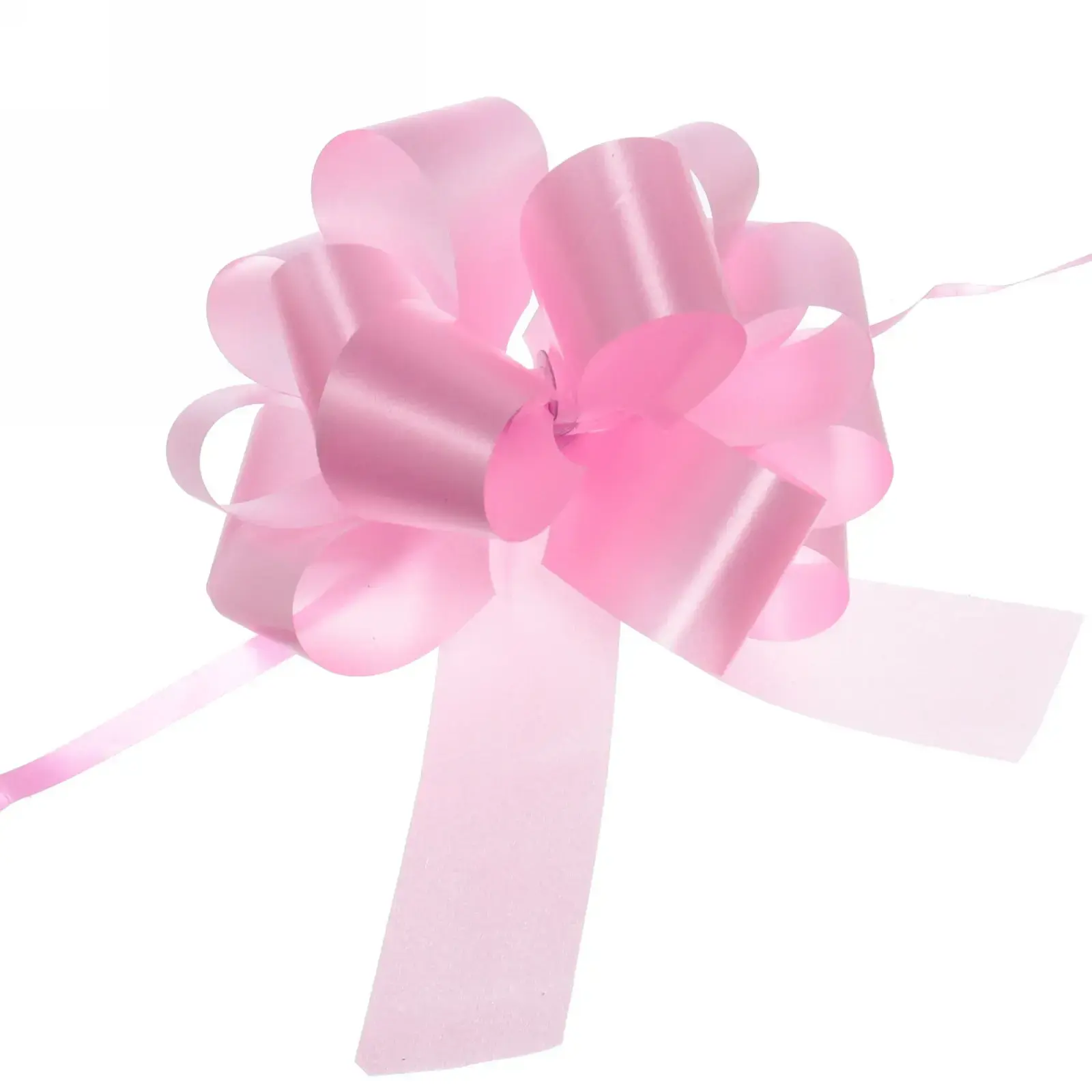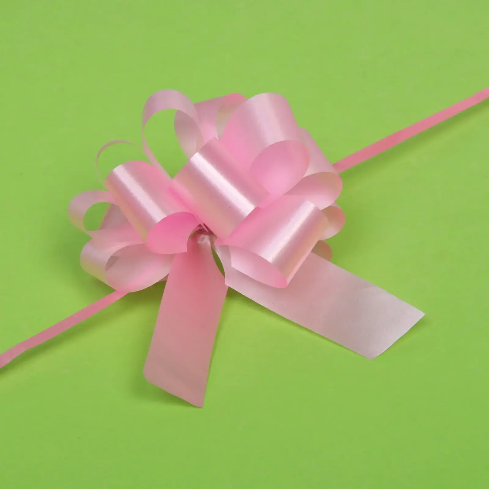 Бант имеет объемную форму с несколькими завитками, что придает ему эффектный вид. Его гладкая и блестящая поверхность делает его привлекательным для глаз. Размеры банта: высота 3 см, диаметр 11 см. Он представлен в нежном розовом цвете, который отлично сочетается с любыми упаковками.