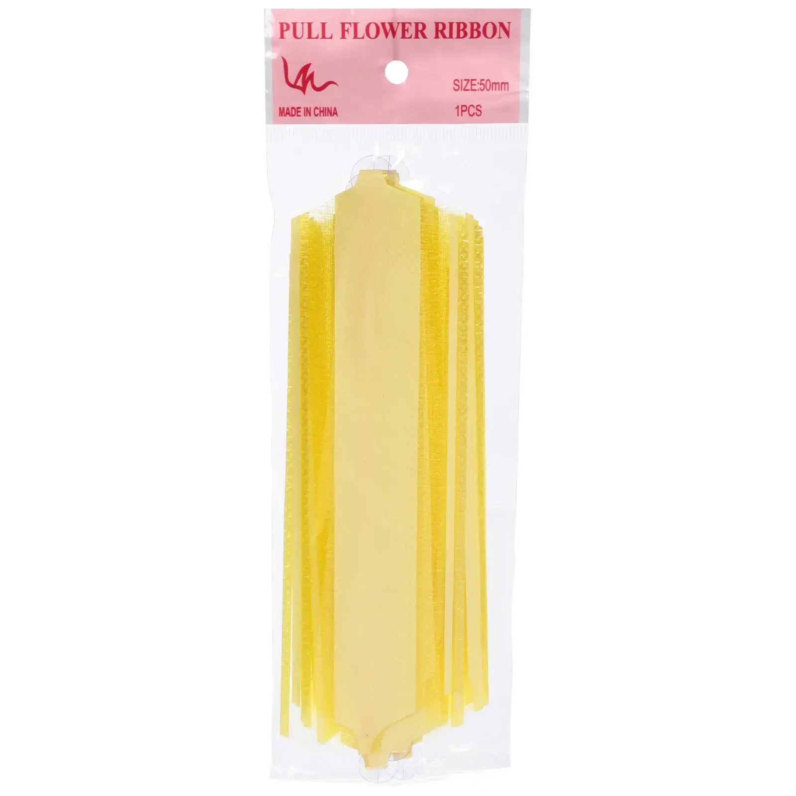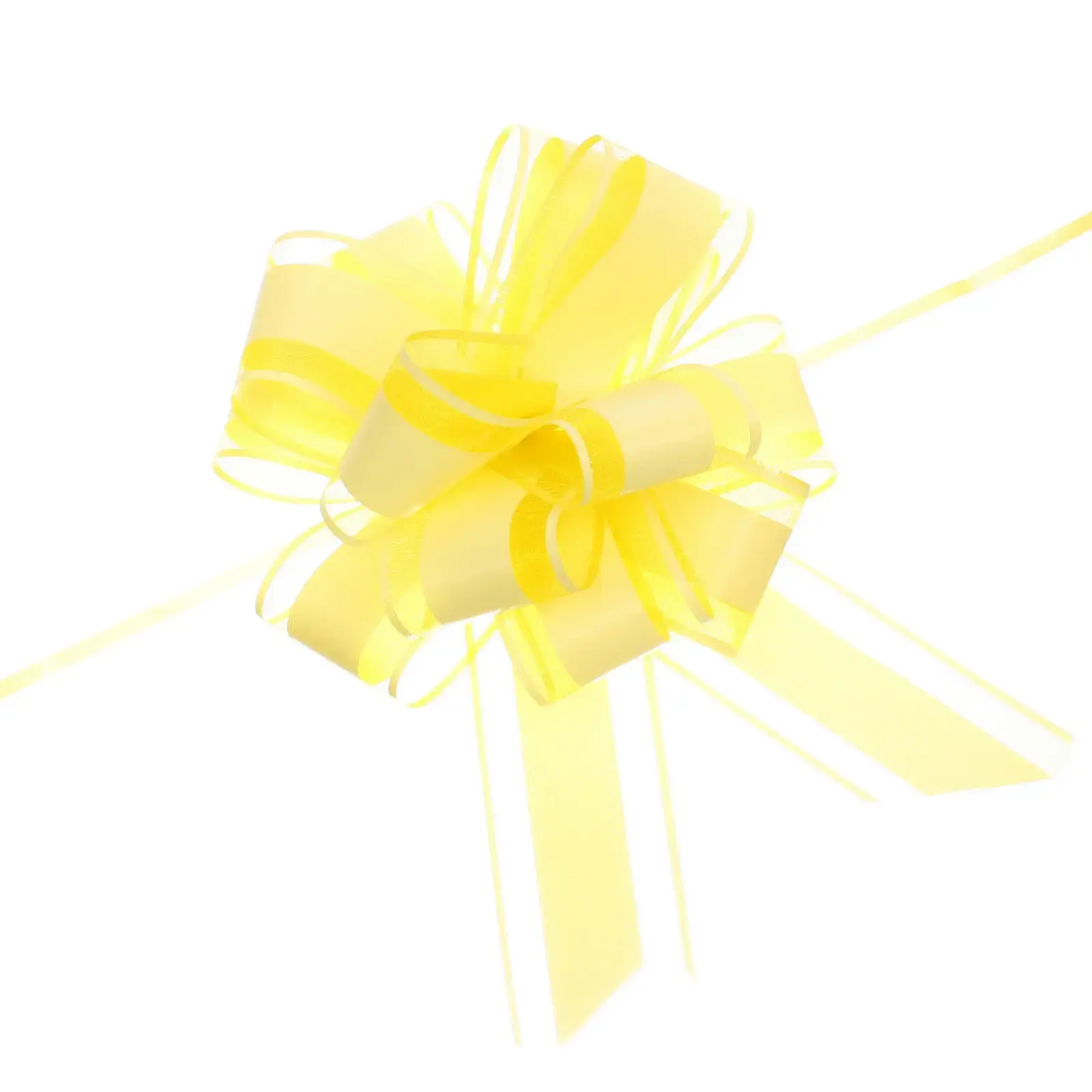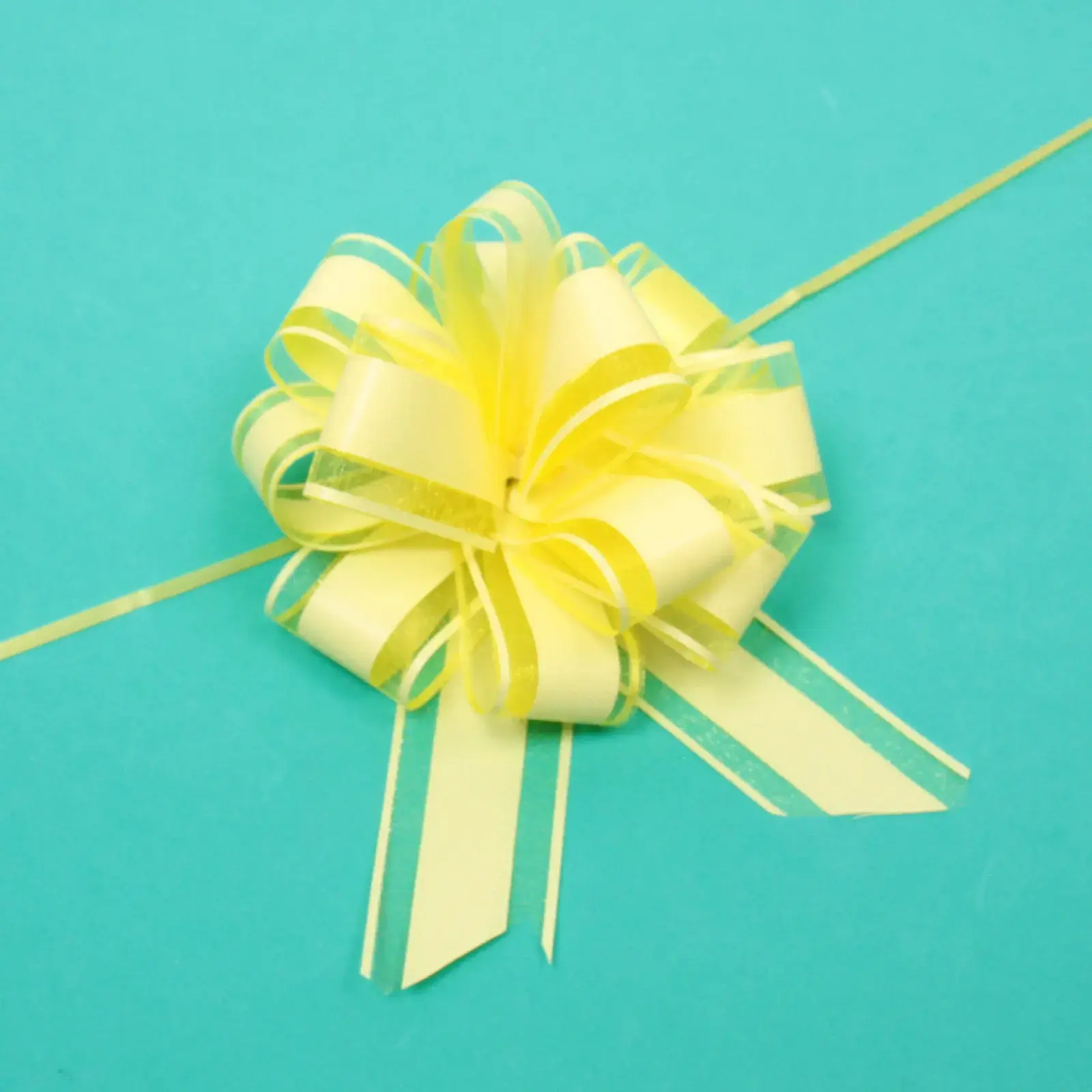Размер банта составляет 5 см в высоту и 15 см в диаметре, что делает его идеальным для различных упаковок. Ярко-желтый цвет с блестящей поверхностью добавляет праздничного настроения. Бант состоит из нескольких слоев ленты, что придает ему объемный вид и делает его еще более привлекательным.