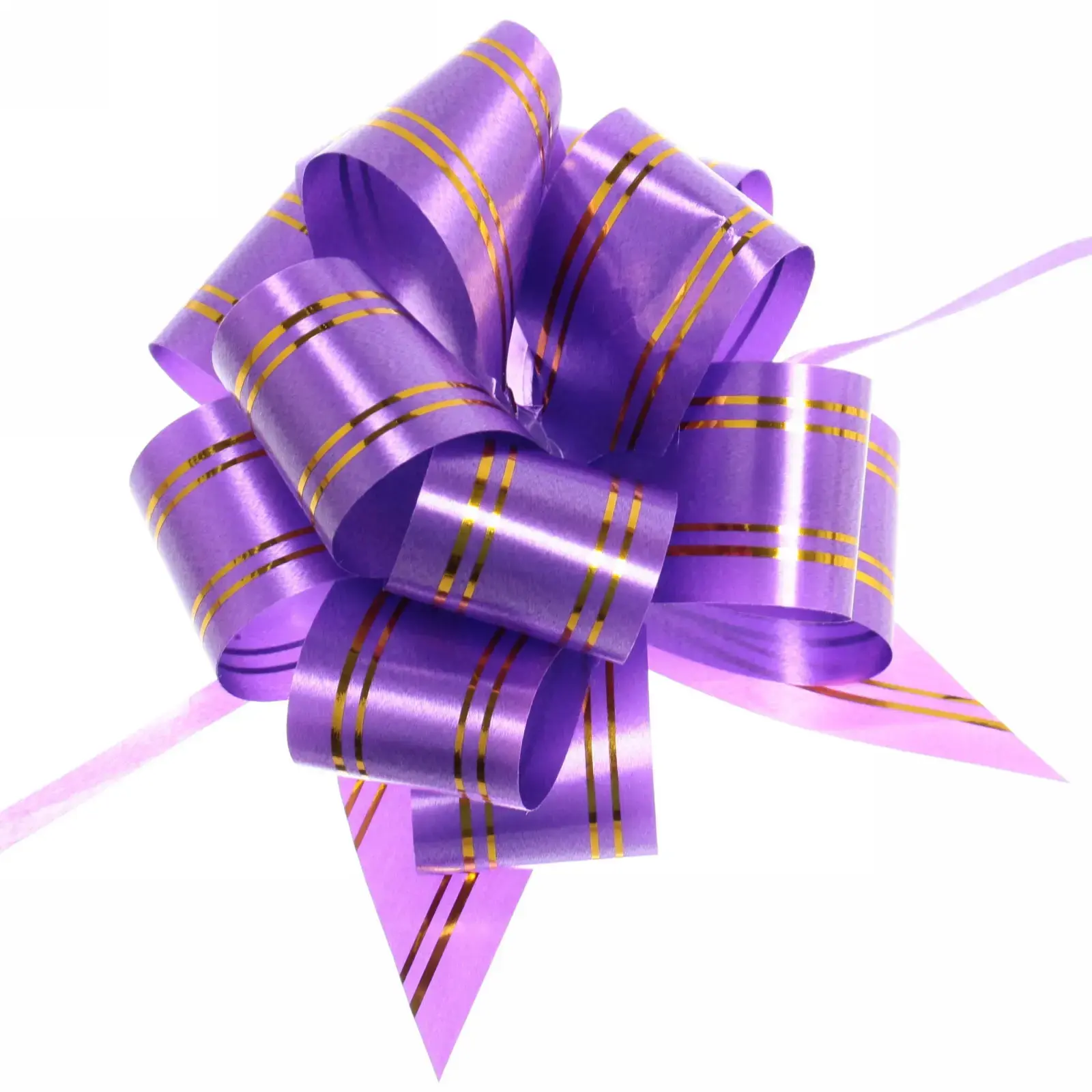 Размер банта составляет 3 см в высоту и 11 см в диаметре, что делает его универсальным для различных упаковок. Фиолетовый цвет с золотыми полосками добавляет яркости и стиля. Этот бантик станет отличным дополнением к любому подарку, подчеркивая вашу заботу и внимание к деталям.
