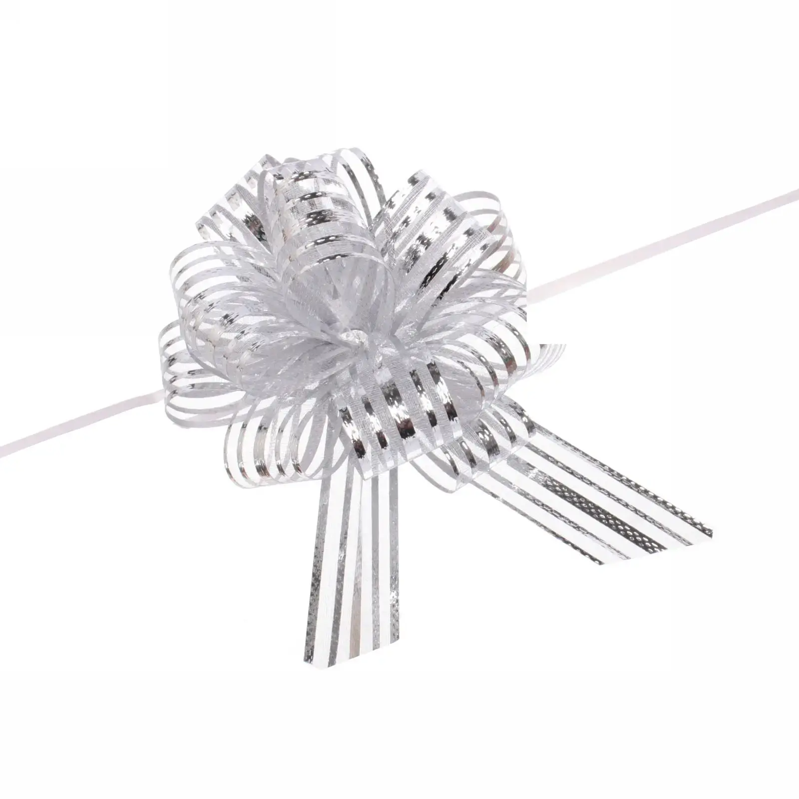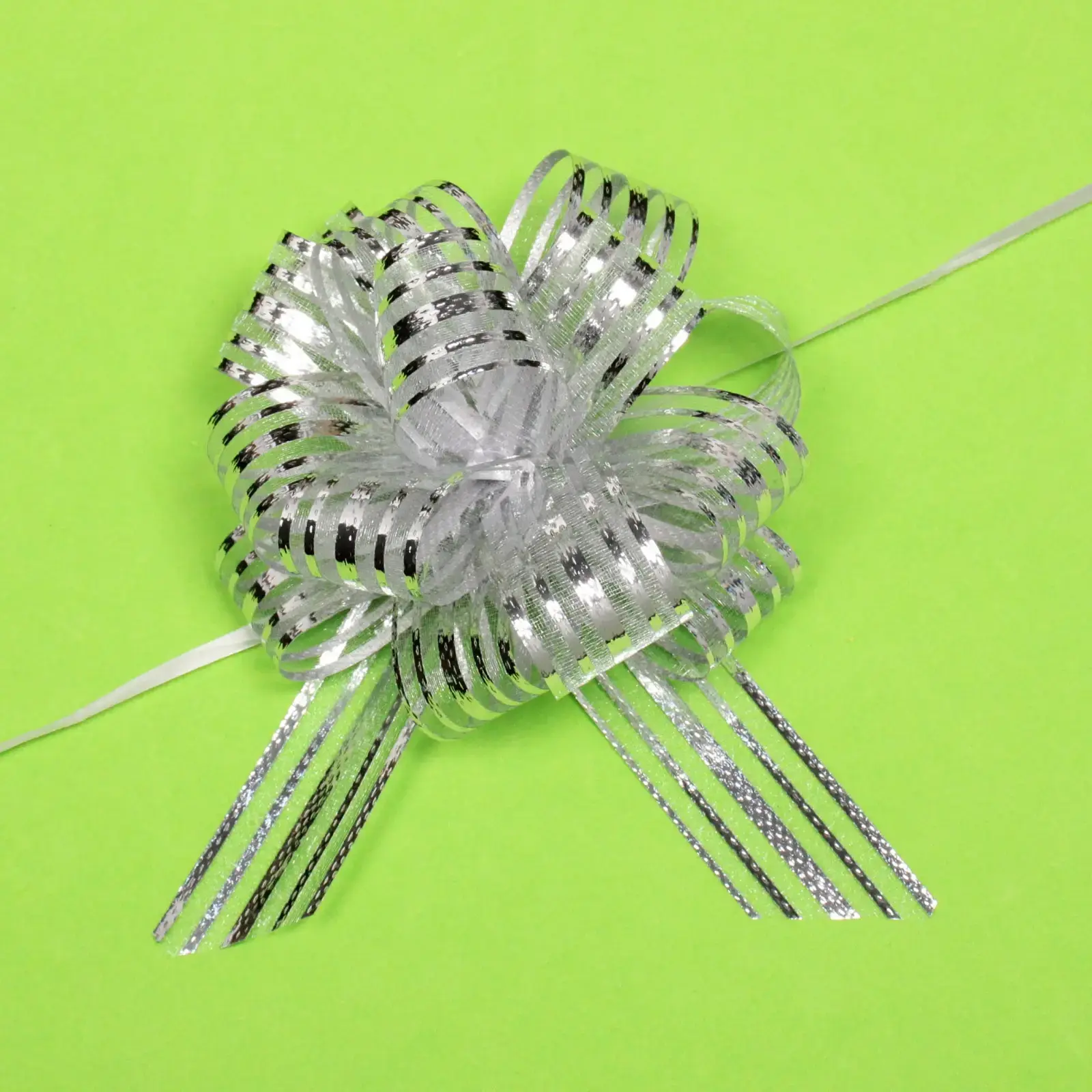 Размер банта составляет 3 см в высоту и 10 см в диаметре, что делает его идеальным для большинства подарков. Серебристый цвет с блестящими элементами добавляет нотку роскоши, а длинные ленты, свисающие вниз, придают завершенность образу. Этот бант станет отличным выбором для тех, кто ценит качество и стиль в оформлении подарков.